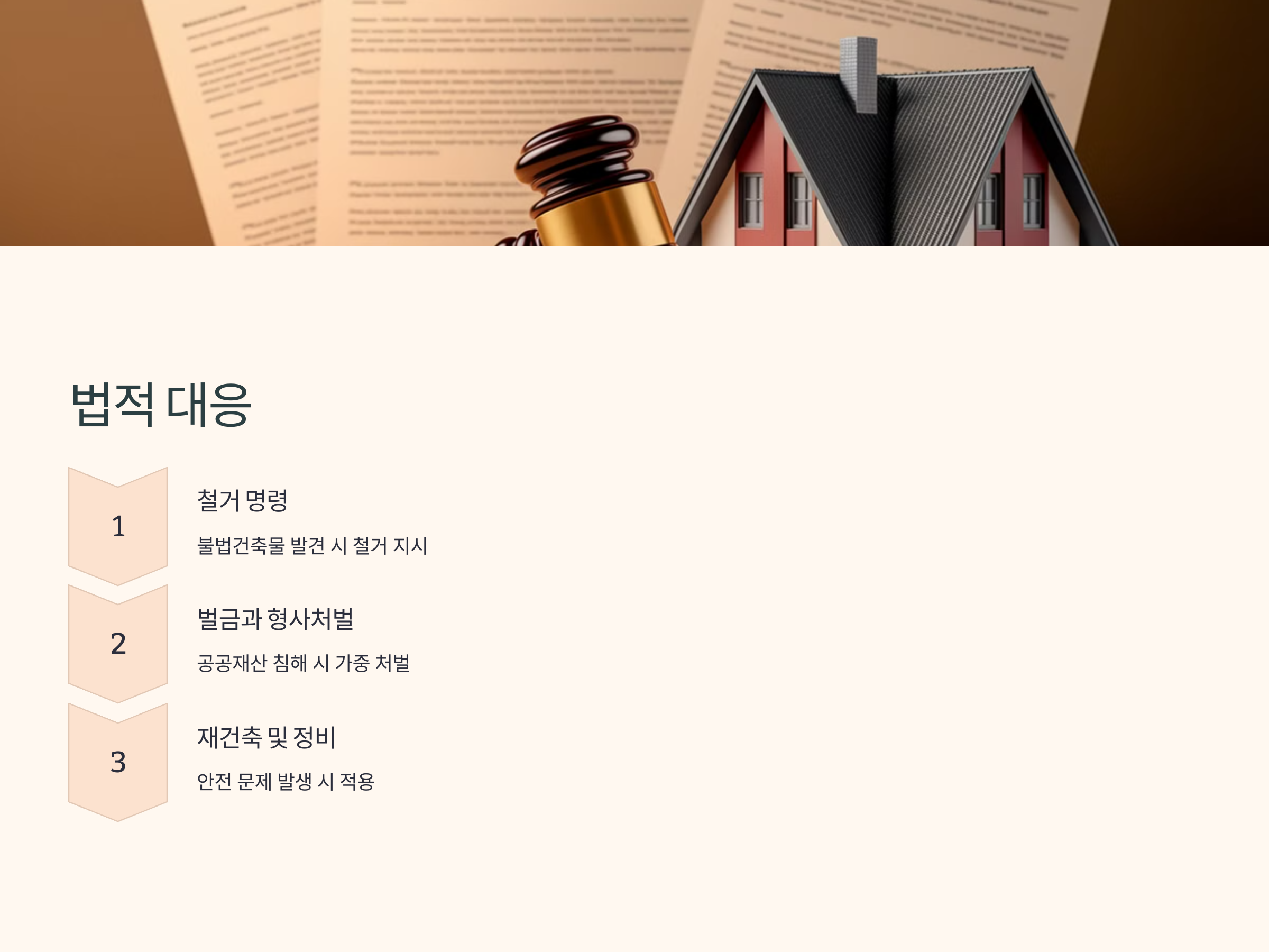 불법건축물은 법적인 책임을 따르며, 정부와 관련 기관은 이를 해결하기 위해 다양한 법적 조치를 취하고 있습니다. 불법건축물에 대한 법적 대응은 크게 두 가지로 나눌 수 있습니다.