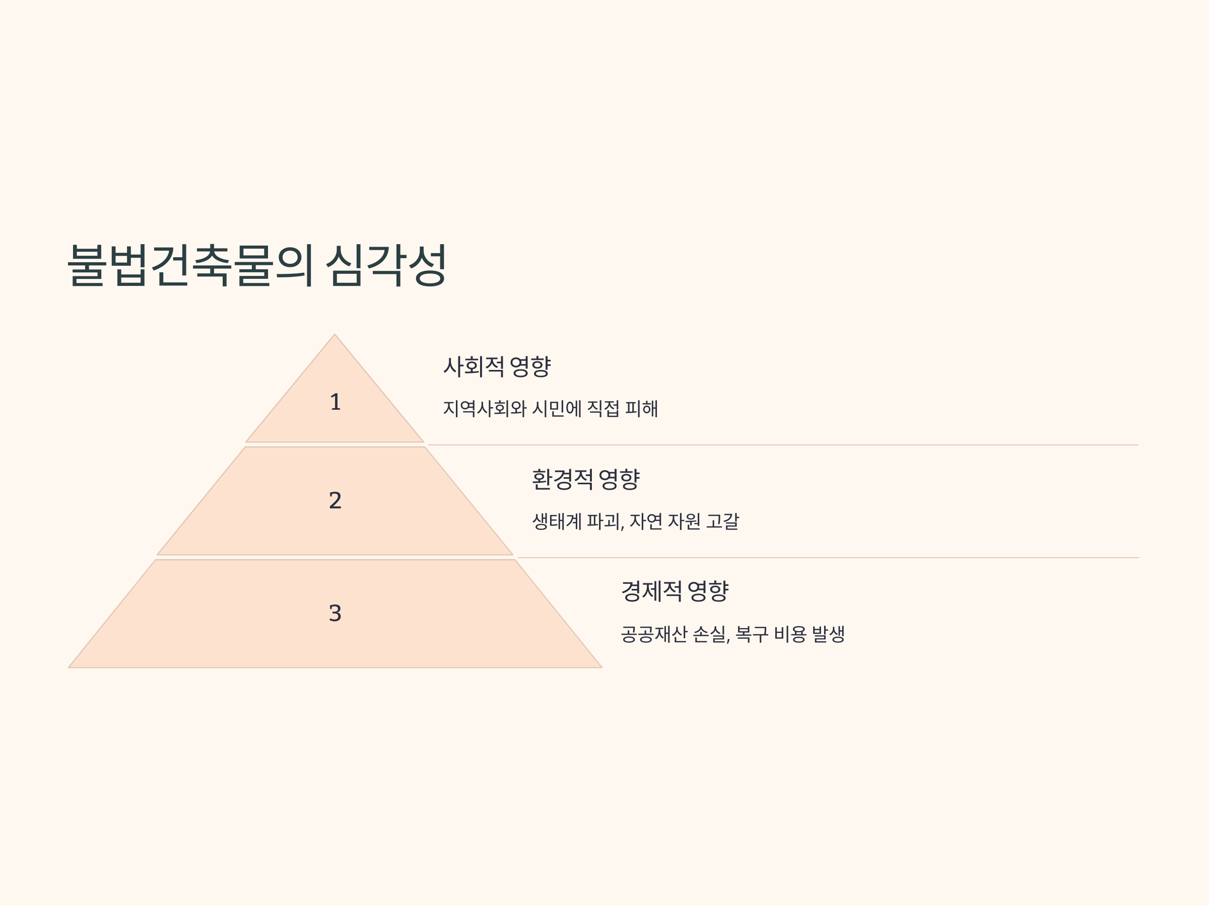 불법 건축물의 건설은 종종 환경을 훼손합니다. 예를 들어, 산지나 습지에 불법으로 건설된 건물은 생태계를 파괴하고, 지역의 자연 자원을 고갈시키는 결과를 낳습니다. 이로 인해 지역 주민들뿐만 아니라, 더 넓은 지역사회까지 피해를 입을 수 있습니다.