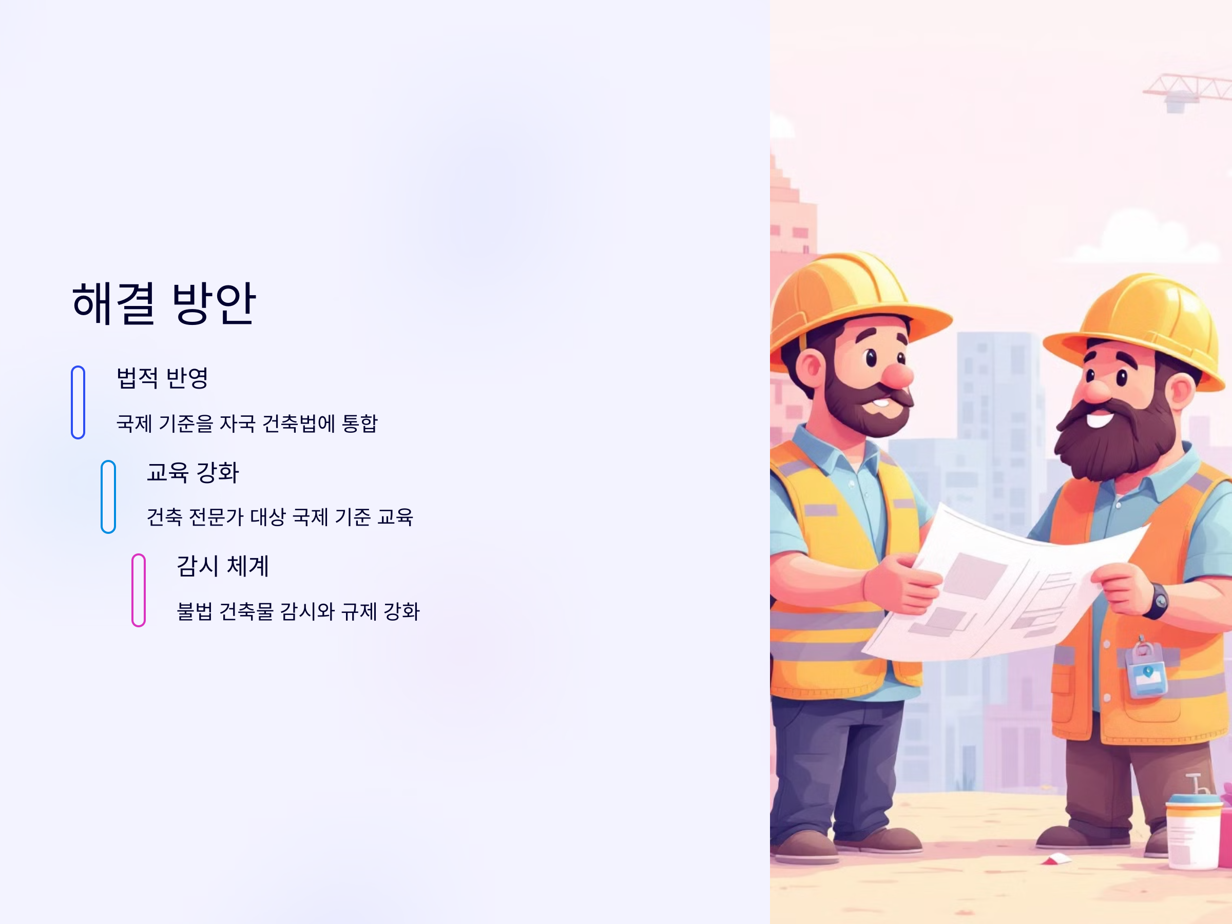 둘째, 국제 건축 기준에 맞춘 건축 교육과 훈련이 필요합니다. 건축 전문가와 관계자들이 국제 기준을 충분히 이해하고 적용할 수 있도록 교육을 강화해야 합니다. 이를 통해 건축 과정에서 발생할 수 있는 법적 문제나 안전 문제를 사전에 예방할 수 있습니다.