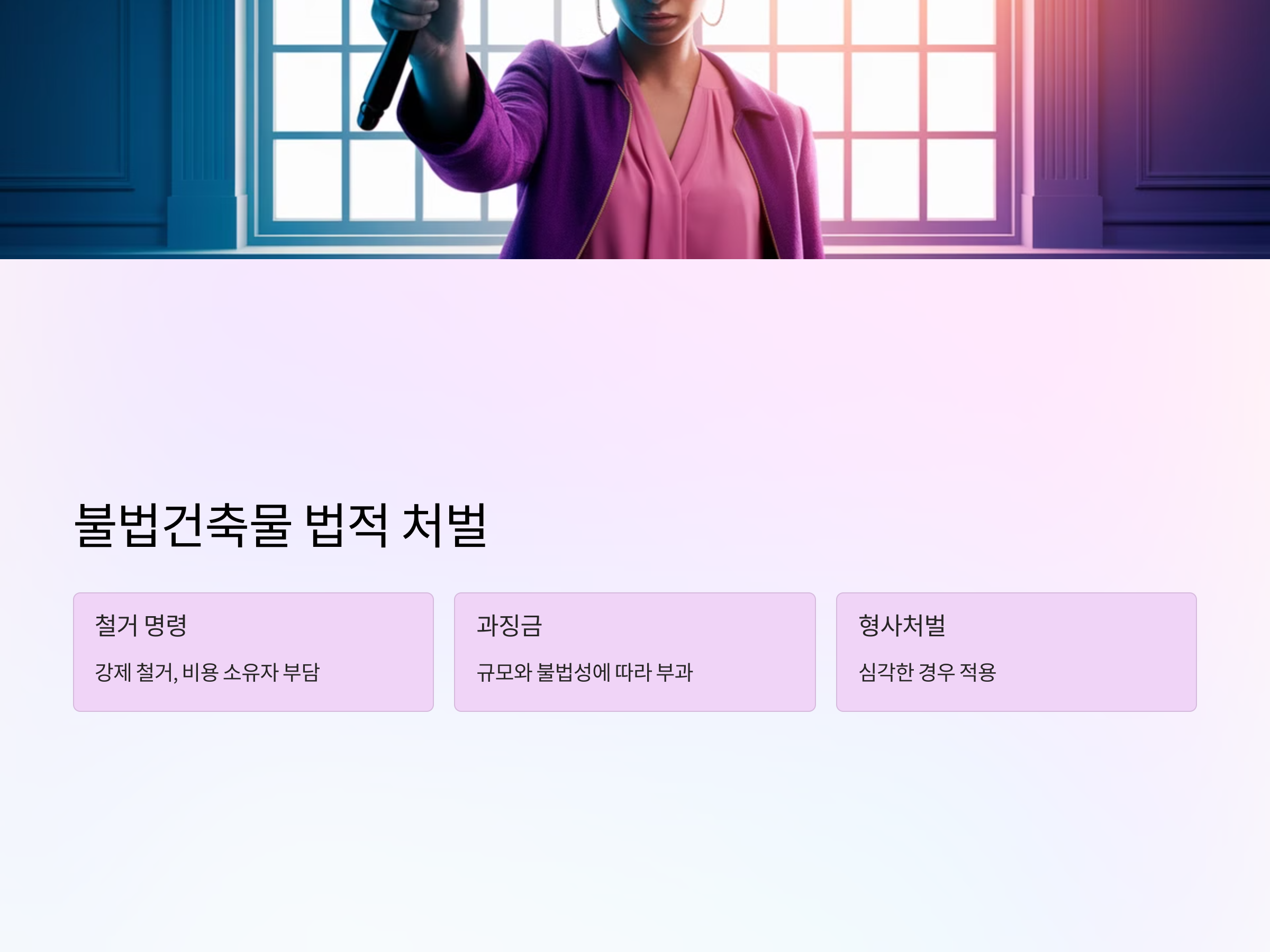 불법건축물에 대한 처벌은 상당히 엄격합니다. 법을 위반한 경우, 철거 명령이나 과징금이 부과될 수 있으며, 심각한 경우 형사처벌도 받을 수 있습니다.
