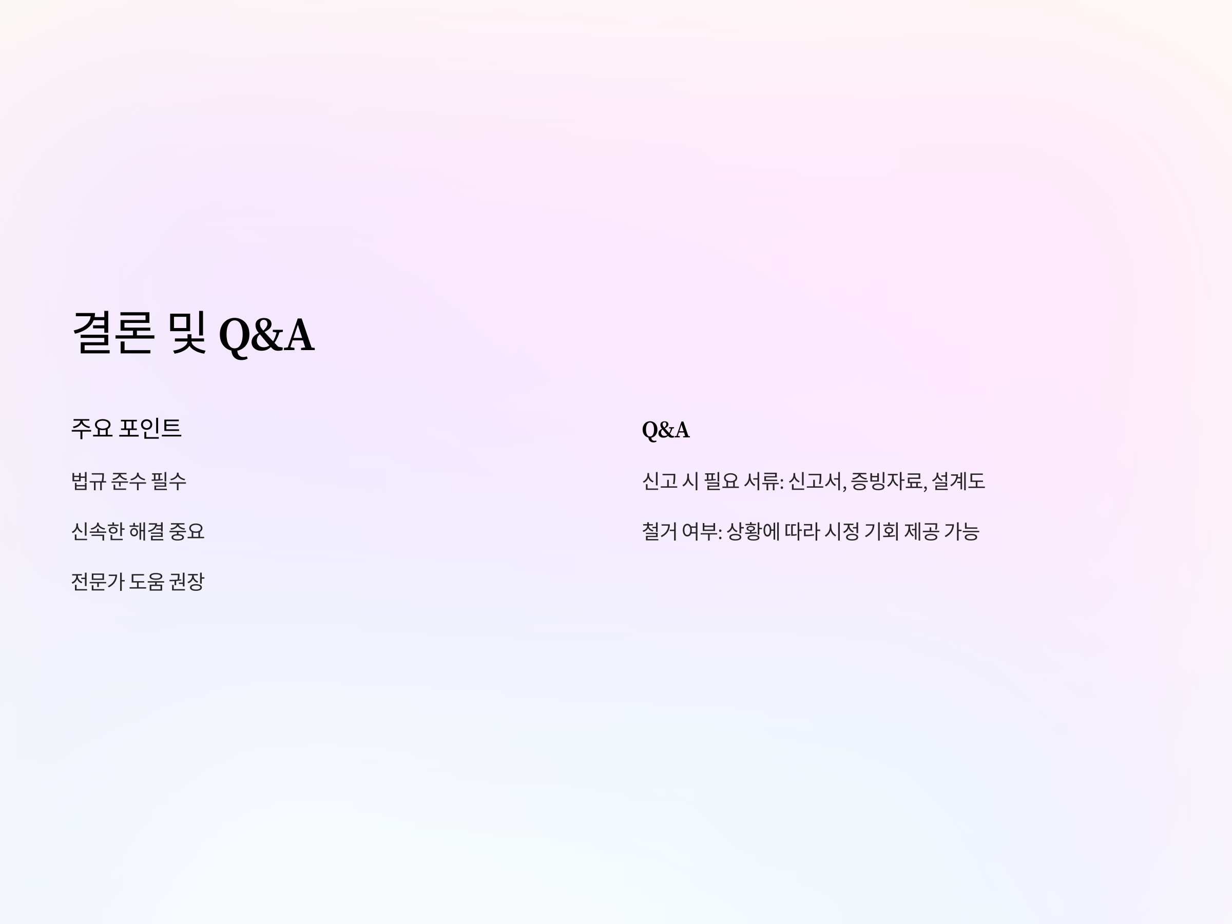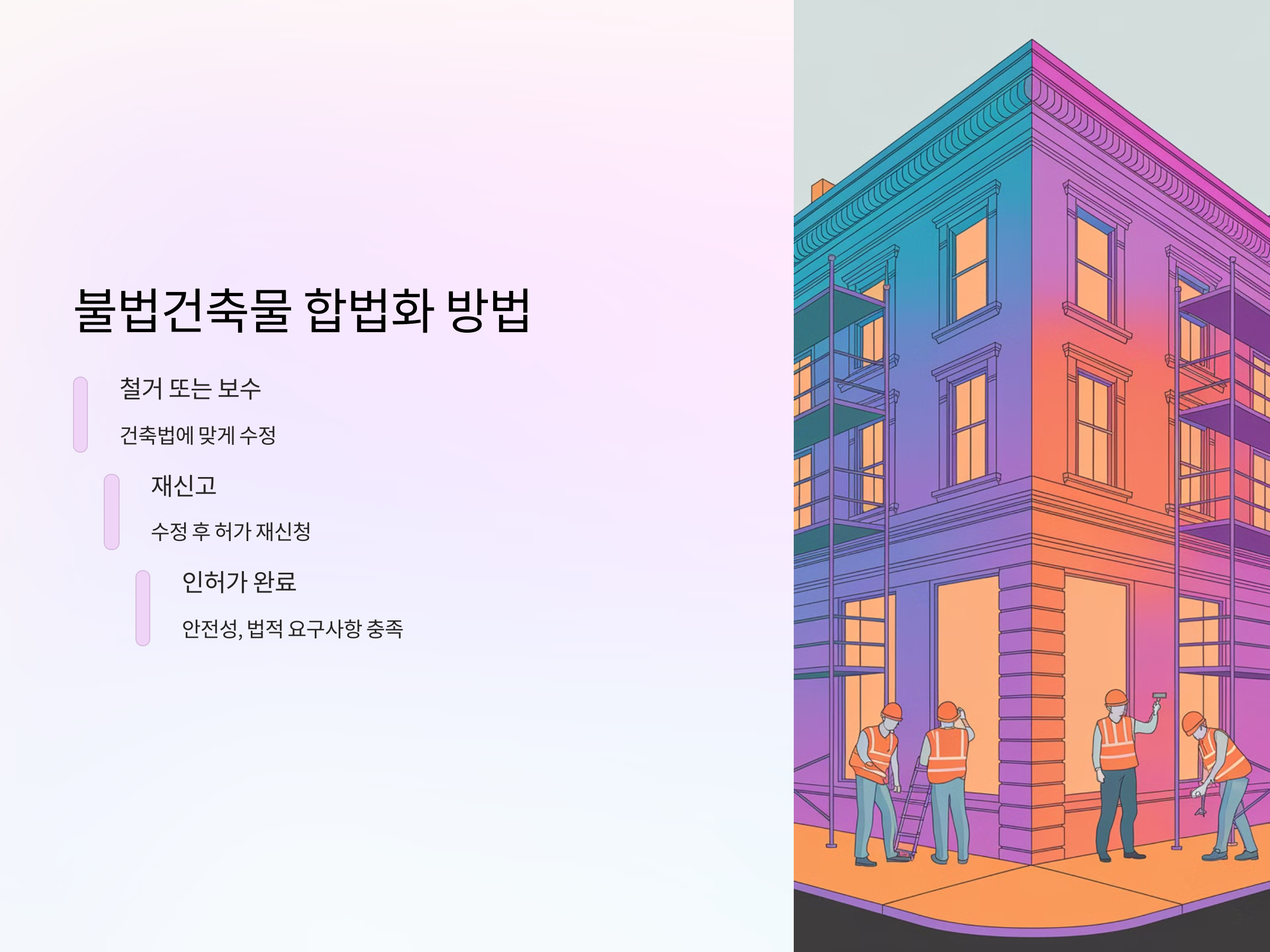 - 인허가 완료: 모든 요구 사항이 충족되면, 건축물은 최종적으로 합법화됩니다. 이 과정에서 건축물의 안전성 및 법적 요구 사항을 충족하는 것이 매우 중요합니다.