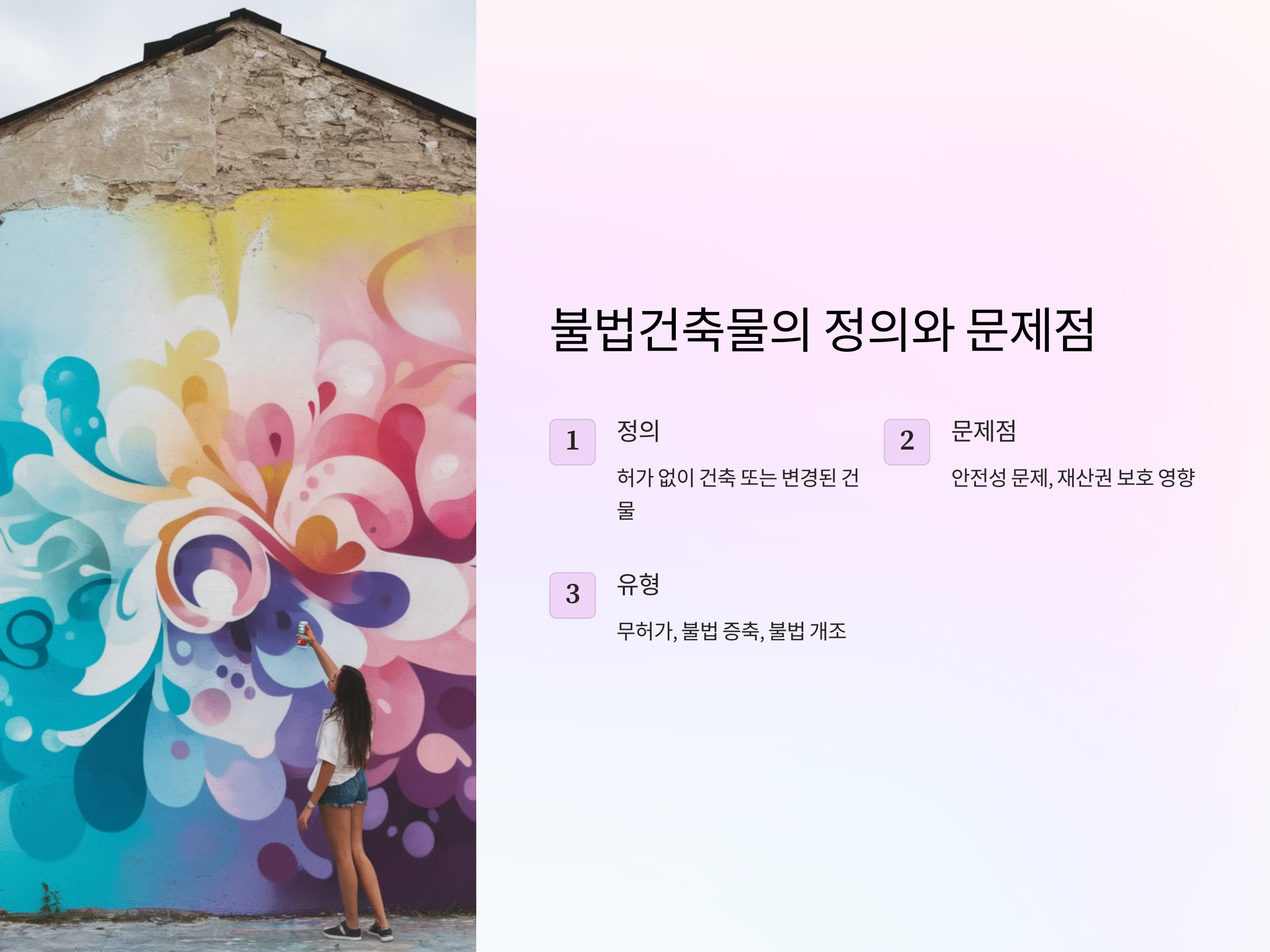불법건축물은 법적으로 건축 허가를 받지 않거나, 허가받지 않은 상태에서 변경된 건축물을 말합니다. 이는 건축법을 위반한 것이기 때문에 여러 법적 문제를 초래할 수 있습니다. 불법건축물은 안전성 문제뿐만 아니라, 재산권의 보호에도 심각한 영향을 미칠 수 있습니다. 따라서 불법 건축물이 존재한다면, 이를 빨리 해결하는 것이 중요합니다.