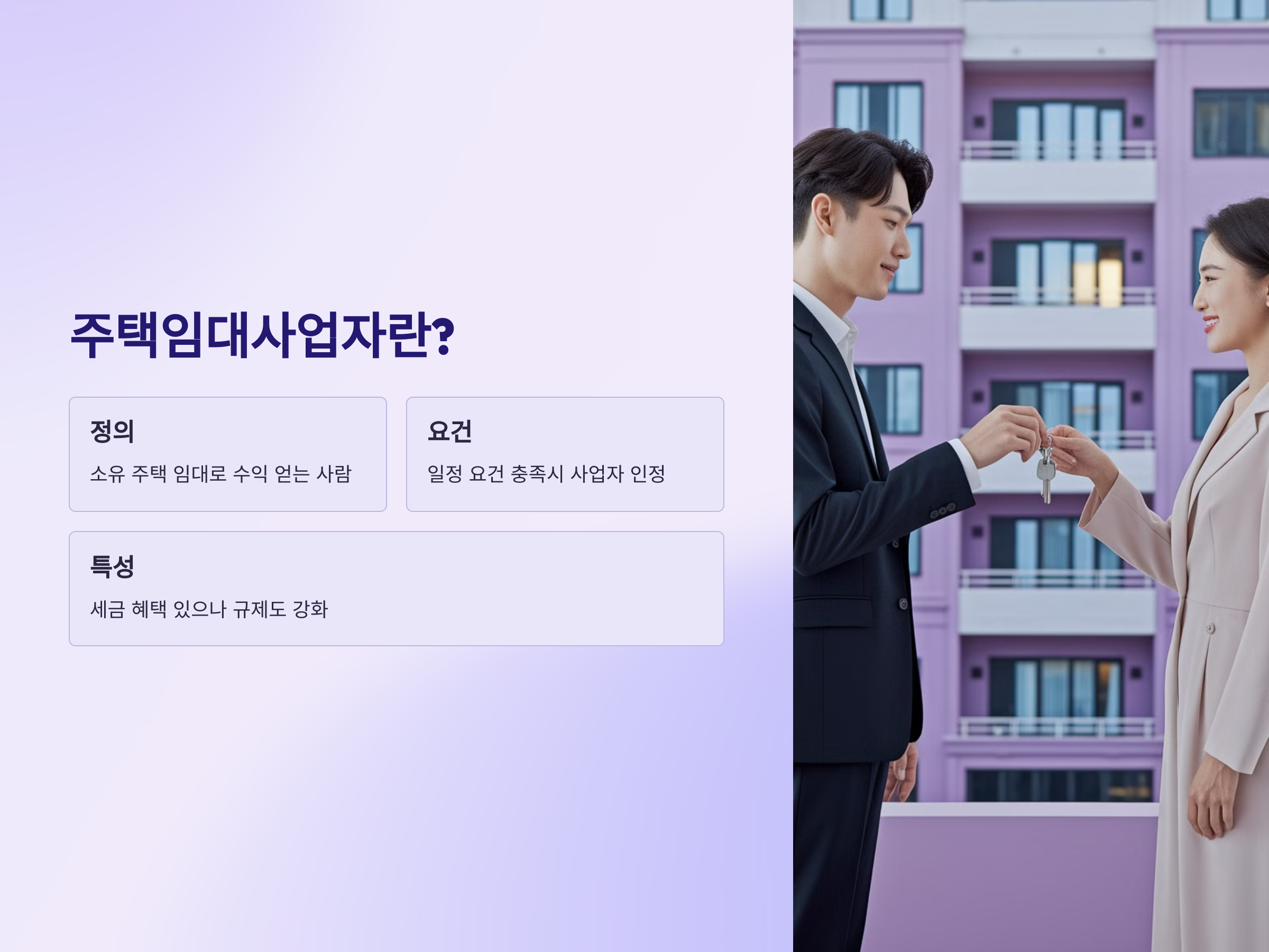 한편, 주택임대사업자는 자신이 소유한 주택을 임대해 수익을 얻는 사람을 말합니다. 최근 몇 년간 정부는 주택 임대시장에 대한 규제를 강화하고 있으며, 이를 통해 시장의 안정화를 도모하고 있습니다. 주택임대사업자는 일정한 요건을 충족해야 사업자로 인정되며, 세금 관련 혜택도 있지만 그만큼 규제와 관리가 강화되고 있습니다.