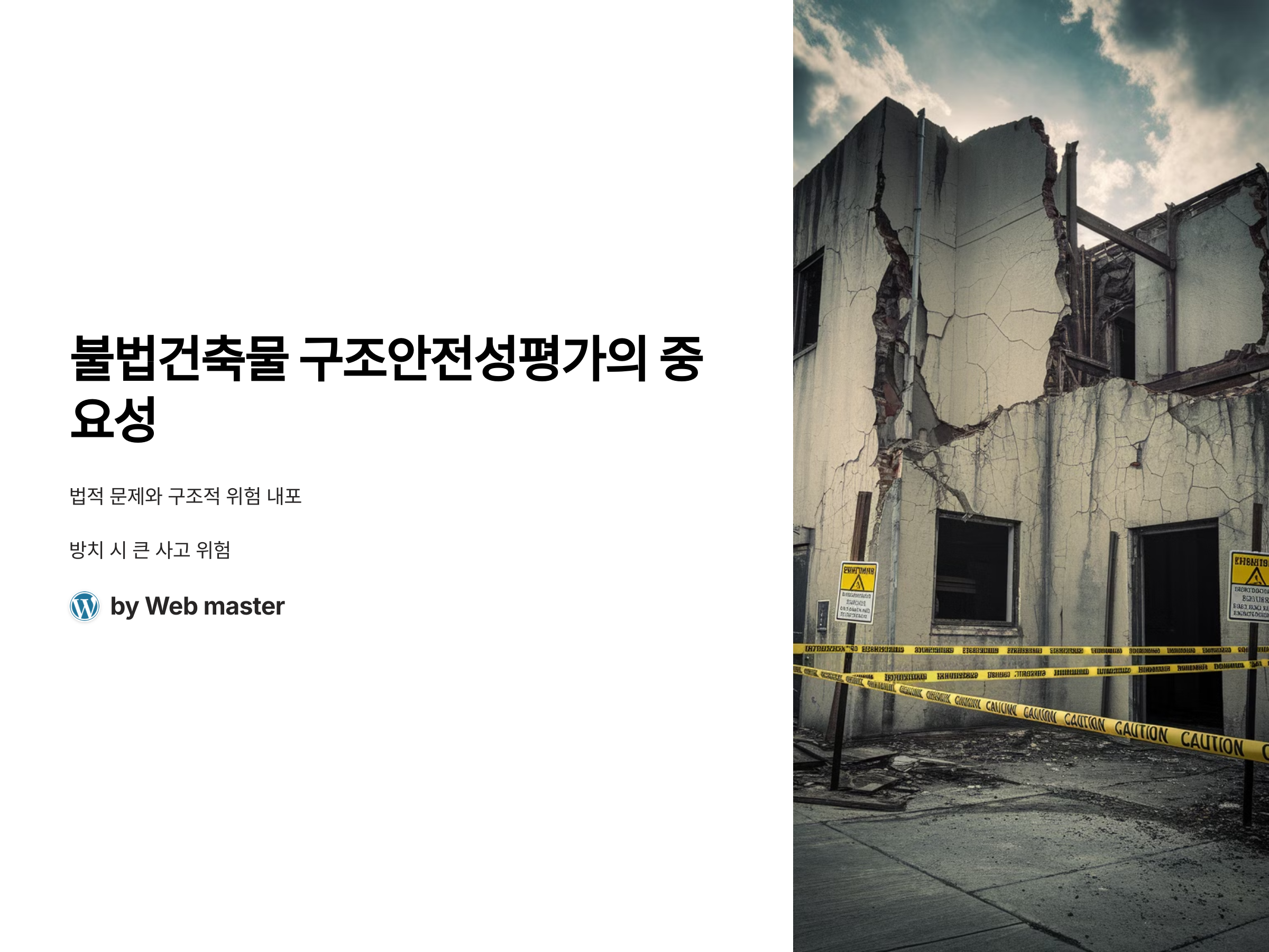 불법건축물은 법적 문제가 있을 뿐만 아니라, 구조적으로도 많은 위험을 내포하고 있습니다. 이를 방치하면 안전사고나 법적 처벌을 받을 수 있습니다. 따라서 불법건축물에 거주하거나 이를 소유하고 있다면, 구조안전성 평가를 꼭 받아야 합니다. 전문가의 평가를 통해 건축물의 안전성을 확인하고, 필요한 보강 작업을 진행함으로써 안전과 법적 보호를 동시에 챙길 수 있습니다.