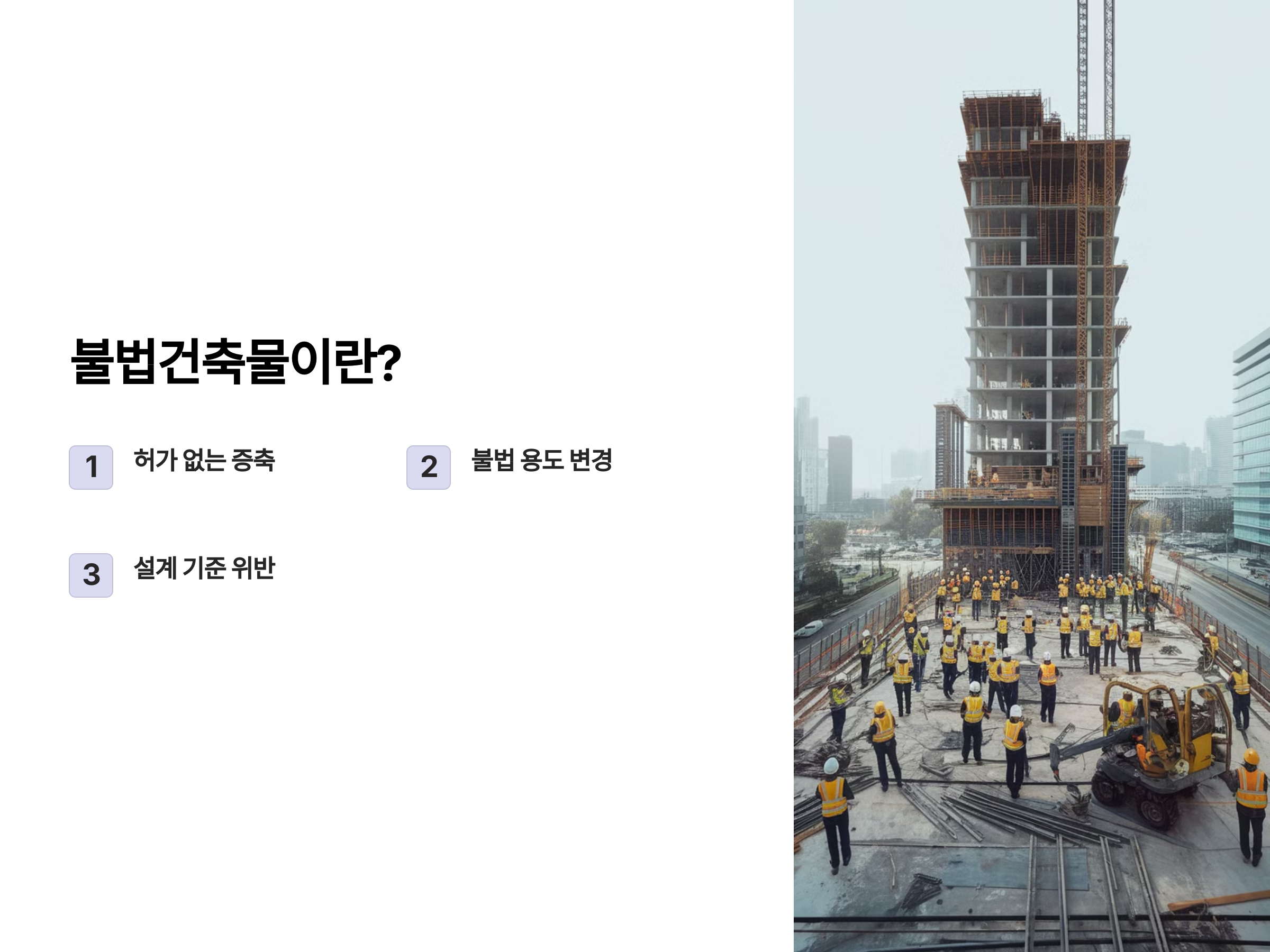 - 허가 없는 증축: 기존 건축물에 대해 법적 승인을 받지 않고 증축을 한 경우.