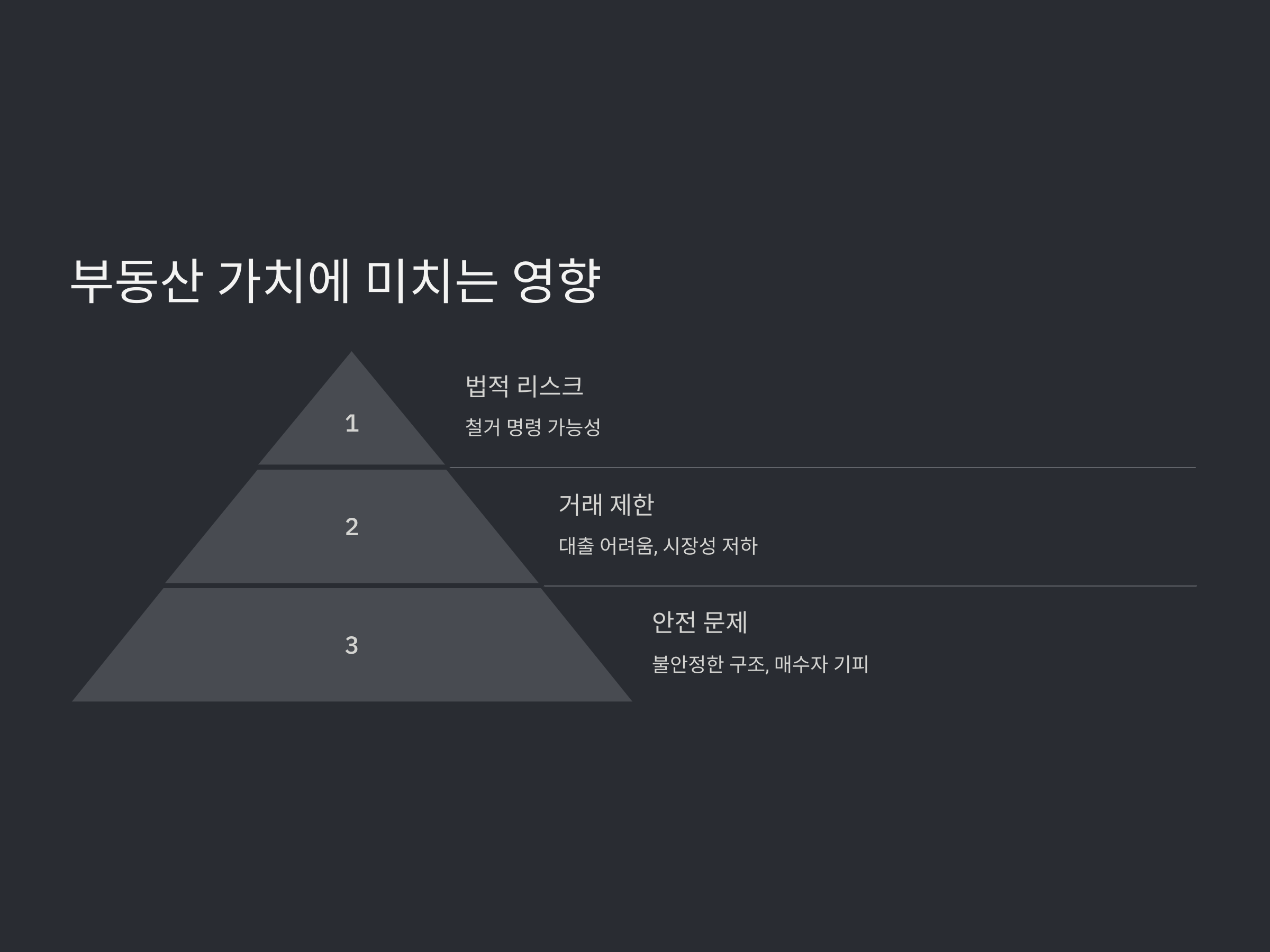 부동산 가치는 여러 요인에 의해 결정되지만, 불법건축물은 그 중 가장 큰 리스크 요인 중 하나로 작용할 수 있습니다. 불법건축물이 포함된 부동산은 다음과 같은 문제들을 야기할 수 있습니다.