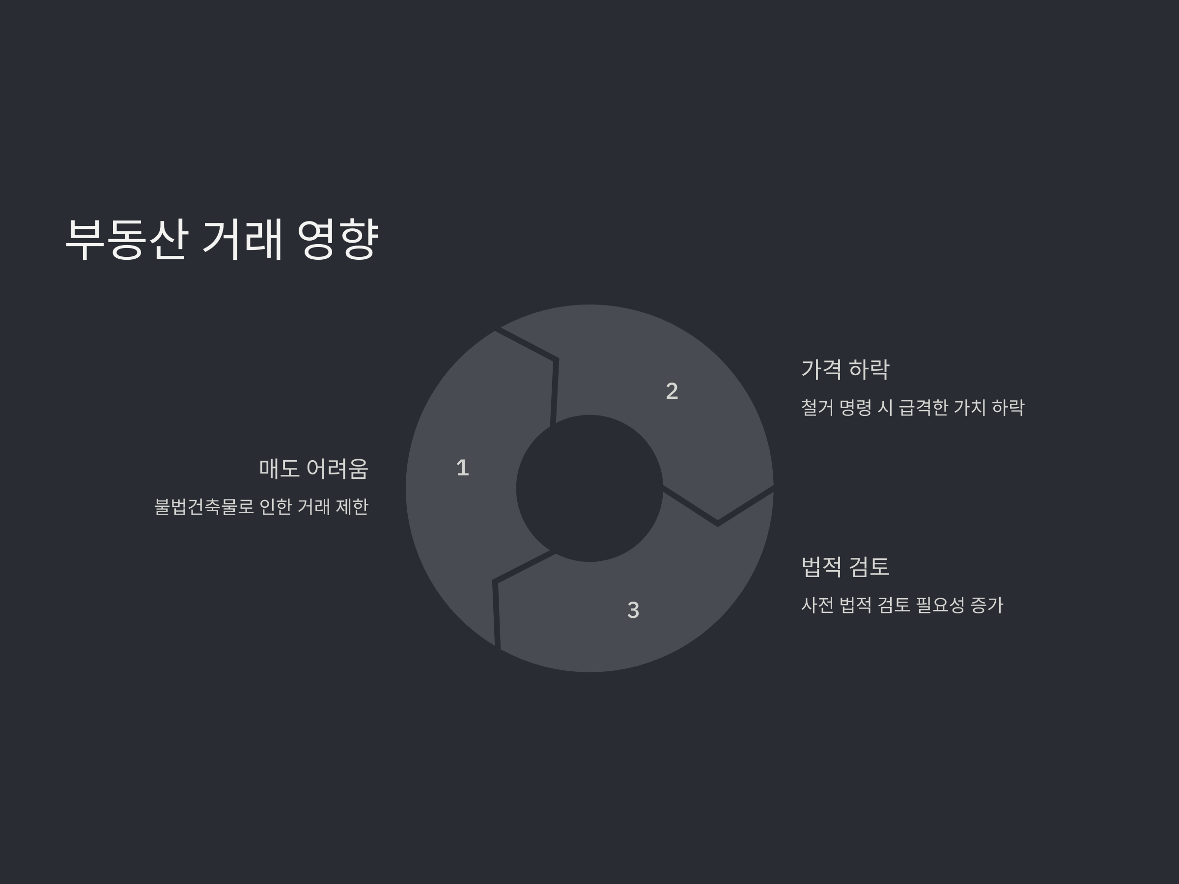 부동산 거래에서는 불법건축물이 큰 영향을 미칠 수 있습니다. 불법건축물이 포함된 부동산은 매수자들에게 큰 리스크로 다가갈 수 있기 때문에, 이를 매도할 때도 어려움을 겪을 수 있습니다. 특히, 불법건축물이 철거 명령을 받을 경우, 해당 부동산의 가격은 급락할 수 있습니다. 이러한 문제를 방지하기 위해서는 사전에 철저한 법적 검토와 조치를 취하는 것이 중요합니다.