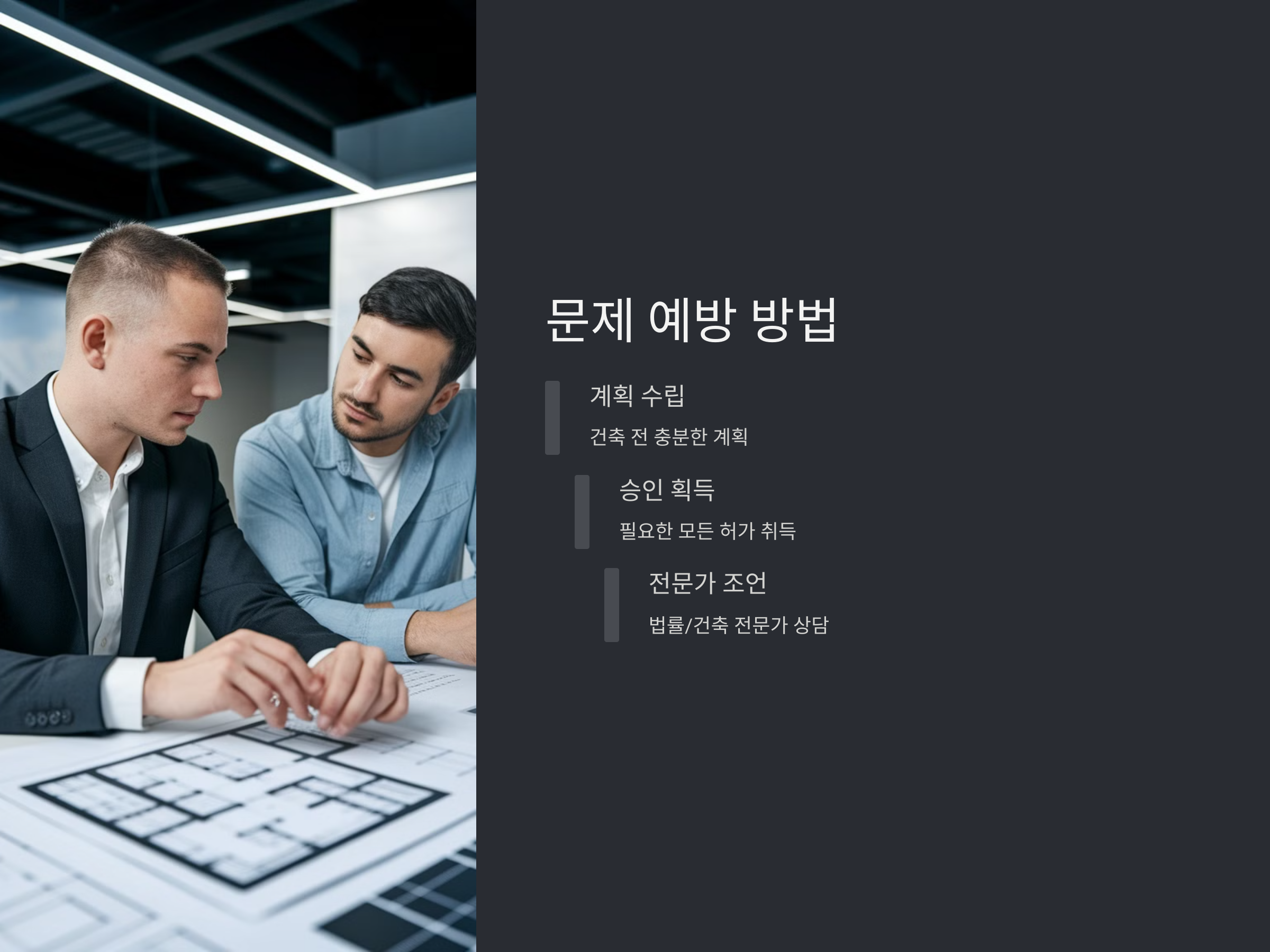 불법건축물 문제를 피하기 위해서는 건축을 시작하기 전에 충분한 계획과 승인을 받아야 합니다. 또한, 기존 건축물에 추가적인 구조물을 건설할 때는 반드시 허가를 받아야 하며, 만약 이미 불법건축물이 포함된 부동산을 구입했다면, 해당 문제를 해결하는 방법을 모색해야 합니다.