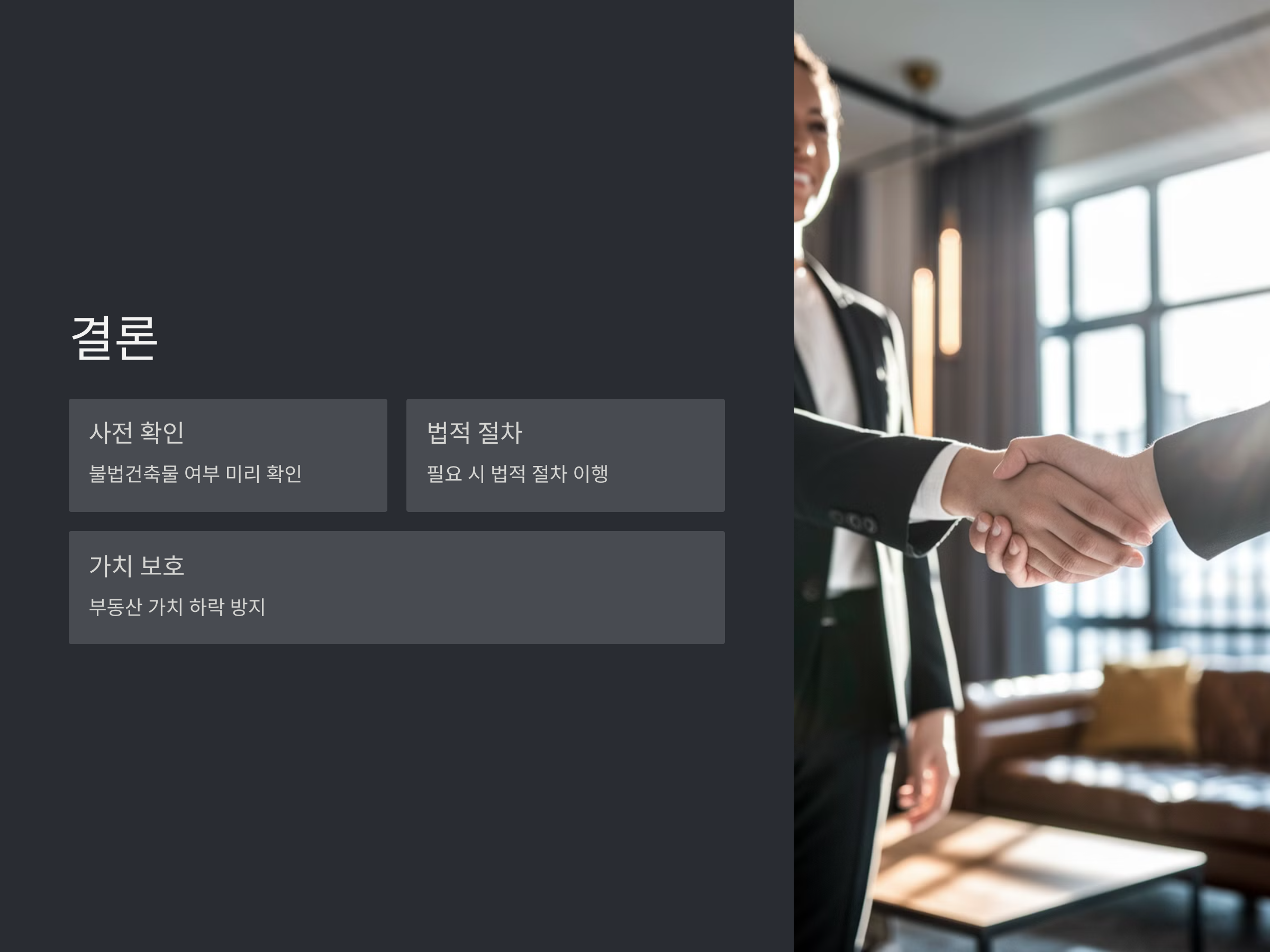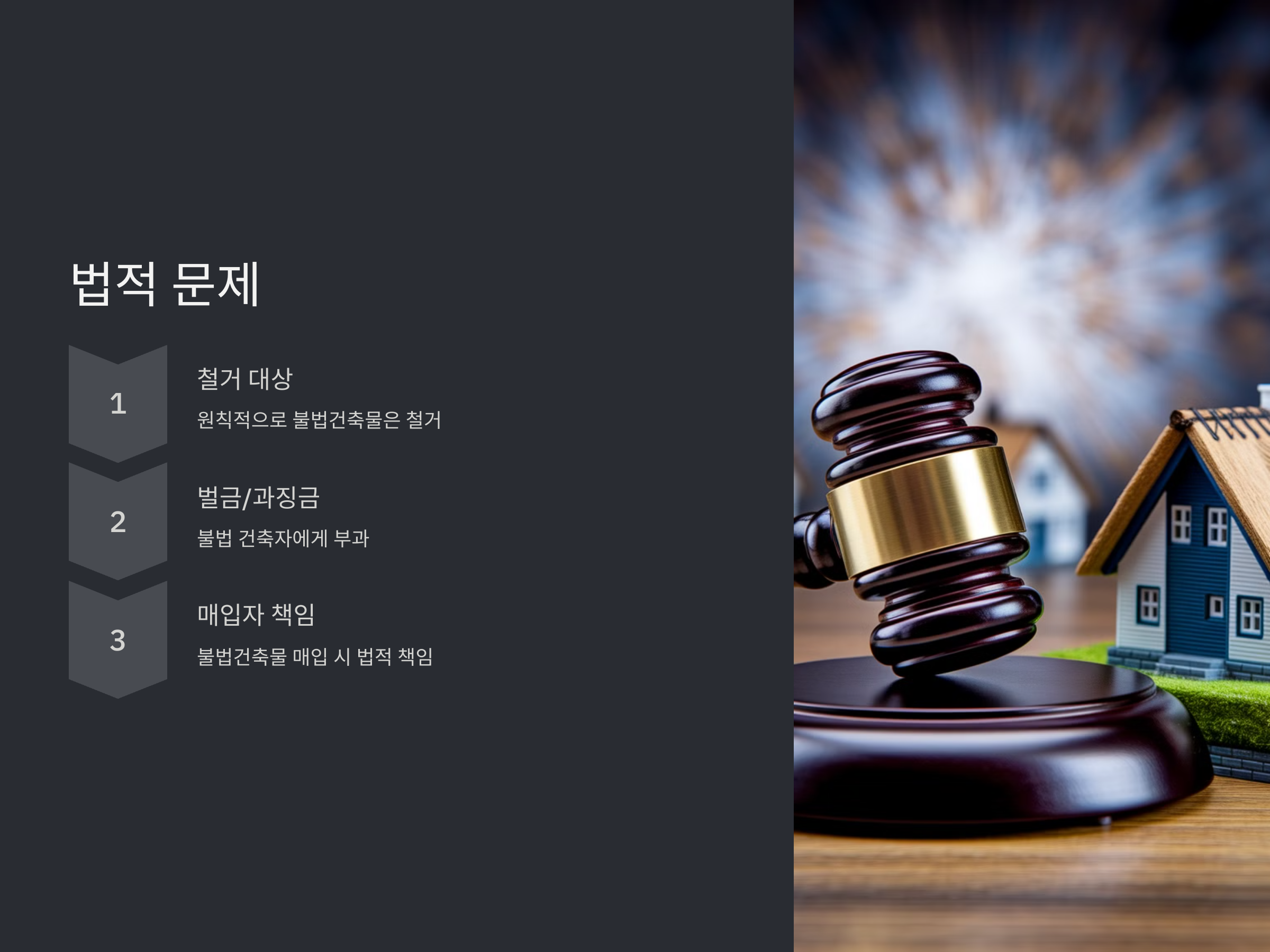 불법건축물은 부동산 가치 하락의 주된 원인 중 하나입니다. 이를 미리 예방하고 해결하기 위해서는 충분한 법적 절차와 검토가 필요합니다. 만약 불법건축물이 포함된 부동산을 구입하고자 한다면, 법적 문제를 해결한 후 진행하는 것이 바람직합니다.