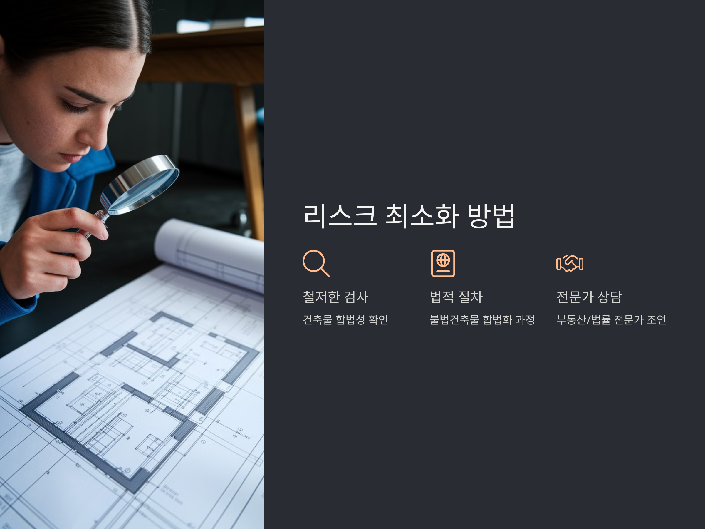 불법건축물이 포함된 부동산을 거래할 때는 다음과 같은 방법으로 리스크를 최소화할 수 있습니다.