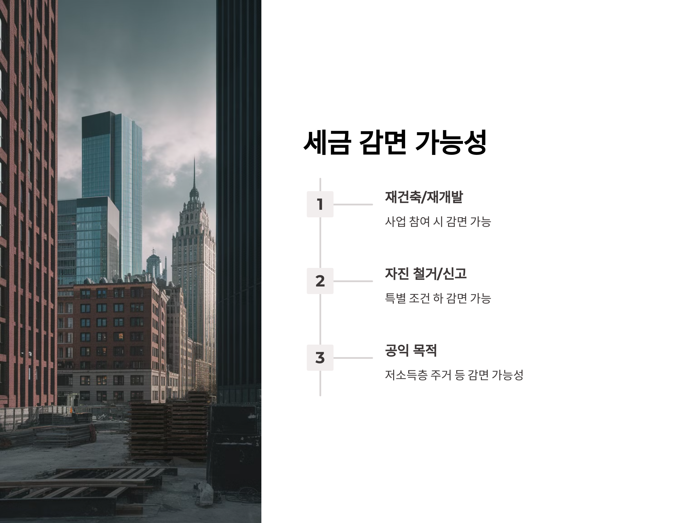 불법건축물이 재건축이나 재개발 사업에 포함될 경우, 세금 감면이 가능할 수 있습니다. 특히 국가나 지방자치단체에서 주관하는 재건축, 재개발 사업에 참여하면, 일정 부분 세금 감면 혜택을 받을 수 있습니다. 이는 불법건축물의 고유 가치를 인정하고, 재건축으로 새롭게 건축되는 과정에서 발생하는 세금 문제를 해결하기 위한 방식입니다.
