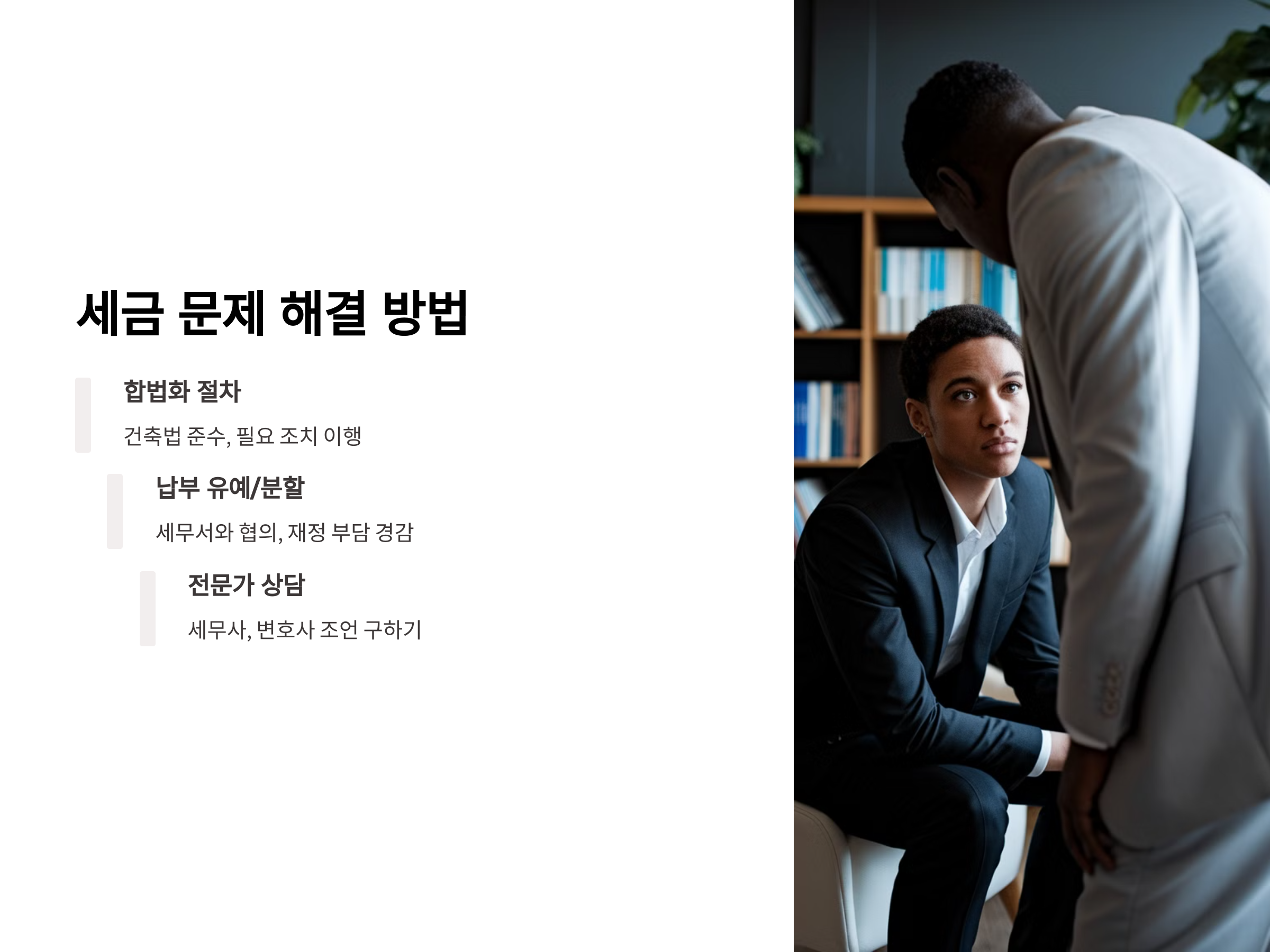 세금 문제는 매우 복잡할 수 있기 때문에, 세무 전문가나 변호사와 상담하는 것이 좋습니다. 전문가의 조언을 통해 세금 감면이나 세금 경감을 받을 수 있는 방법을 찾을 수 있습니다.