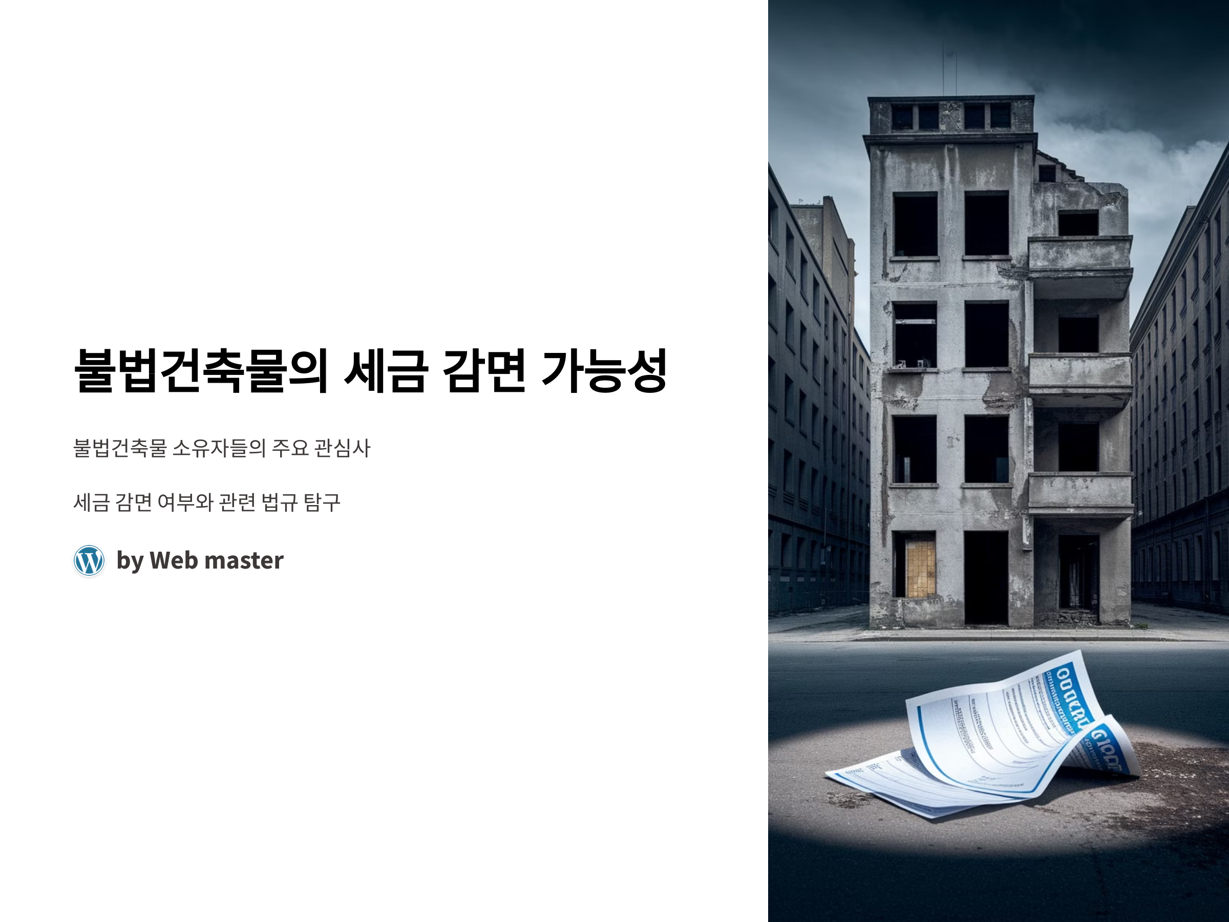 결론적으로, 불법건축물에 대한 세금 감면은 매우 어렵습니다. 불법건축물은 법적으로 인정되지 않기 때문에, 세금 부과가 이루어지고, 감면을 받기 위한 조건은 매우 제한적입니다. 다만, 재건축, 재개발 등의 특별한 경우나 공익적인 목적으로 사용되는 경우, 일부 세금 감면이 가능할 수 있습니다. 불법건축물 문제를 해결하려면, 적법한 절차를 통해 합법화하는 것이 가장 중요한 해결책이 될 것입니다.