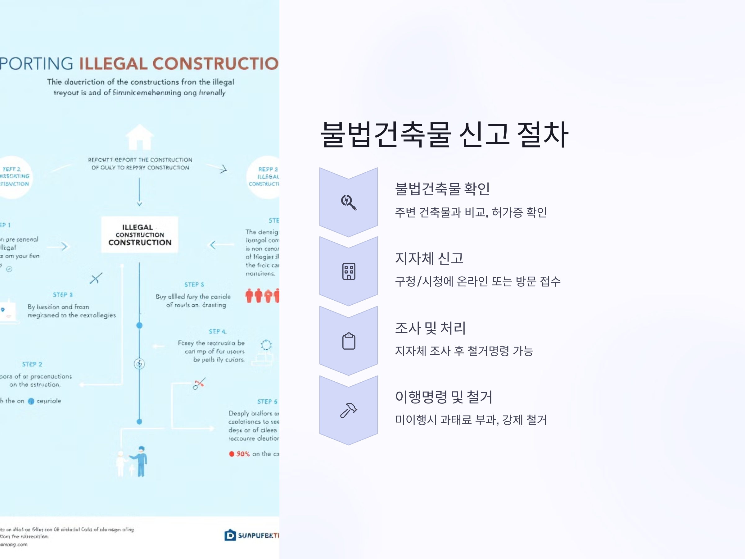 불법건축물 신고 절차는 간단하지만, 신고 후 법적 절차가 진행되기까지는 시간이 걸릴 수 있습니다. 신고 과정은 아래와 같습니다: