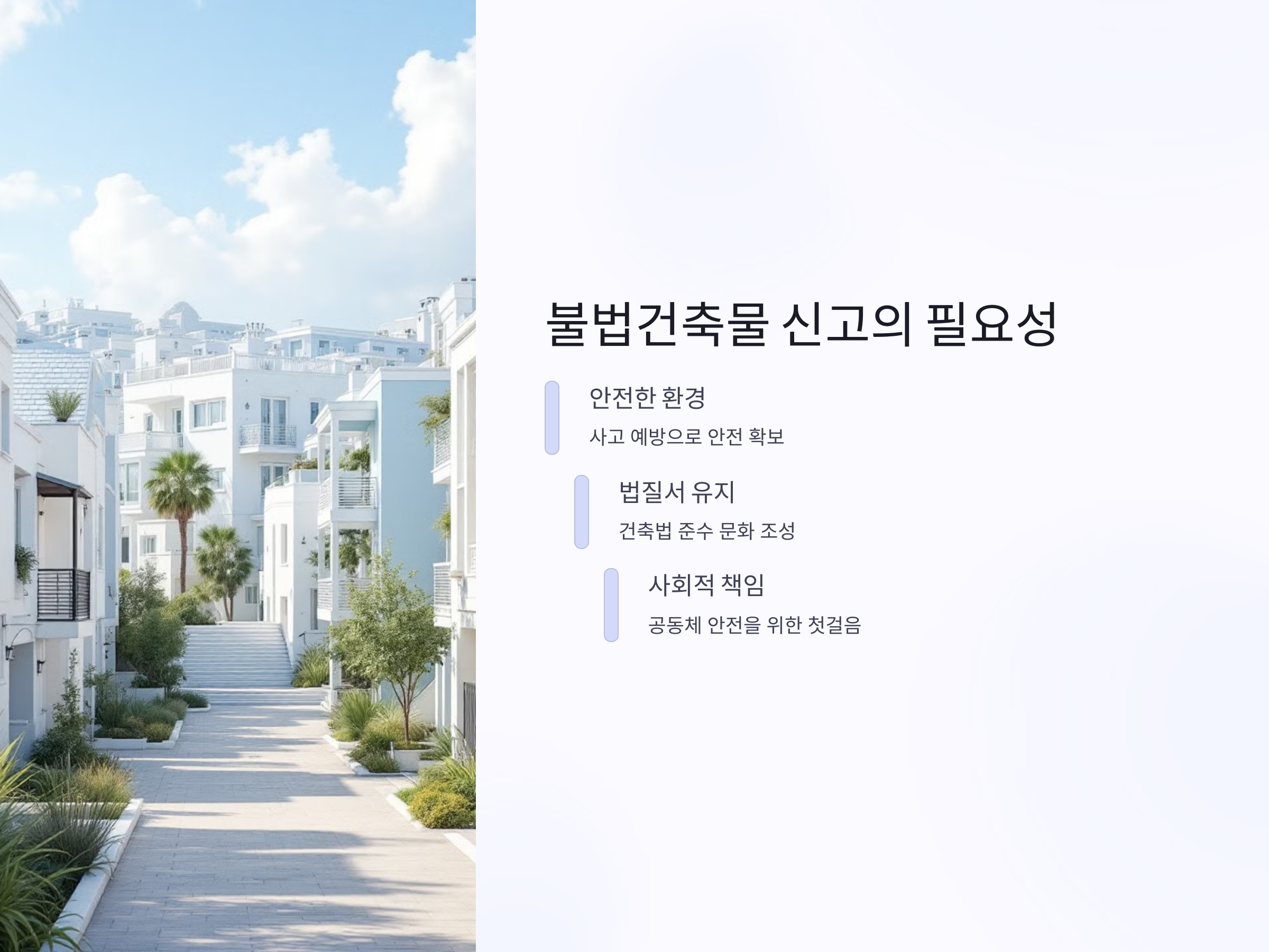 불법건축물 신고는 단순한 법적 의무를 넘어서, 우리 사회의 안전을 지키고, 법질서를 유지하는 중요한 역할을 합니다. 불법건축물을 발견하면 신속하게 신고하고, 적법한 절차에 따라 처리하는 것이 매우 중요합니다. 불법건축물 신고 절차를 잘 알고, 올바르게 신고하는 것은 우리 모두에게 안전한 환경을 제공하는 첫걸음이 될 것입니다.