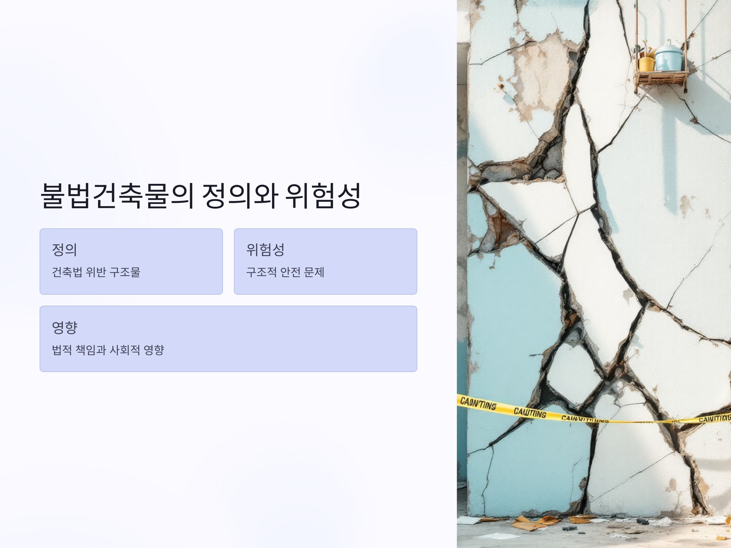 불법건축물은 건축법을 위반한 형태로 건축된 구조물로, 주로 허가를 받지 않거나, 허가된 조건과 다르게 지어진 건축물을 말합니다. 이러한 건축물은 여러 가지 위험을 내포하고 있습니다. 먼저, 구조적으로 안전하지 않을 수 있으며, 그로 인해 사고가 발생할 수 있습니다. 또한 불법건축물은 불법적인 행위로 간주되기 때문에, 법적인 책임을 질 수 있습니다. 이로 인해 불법건축물의 존재는 개인이나 공동체에 큰 영향을 미칠 수 있습니다.