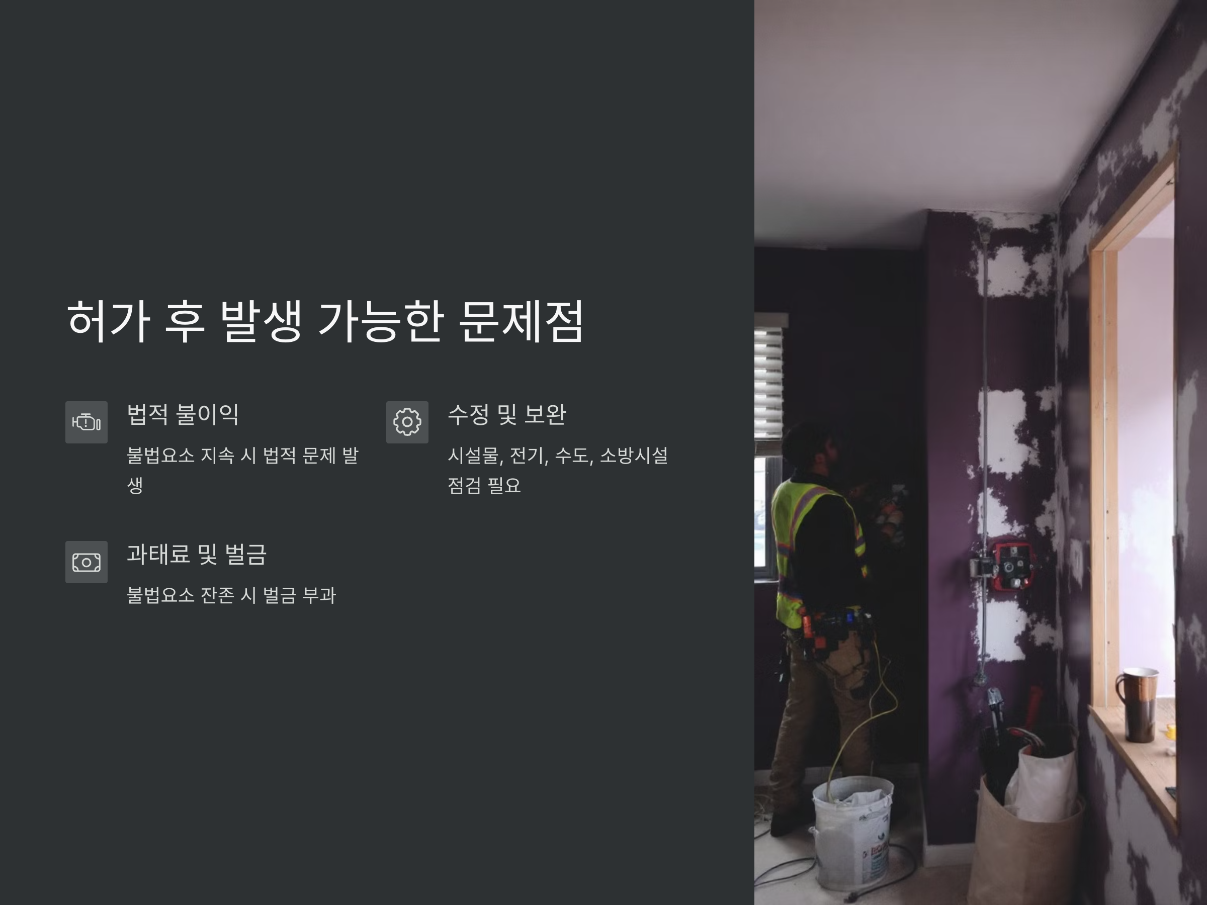 용도변경 허가를 받은 후에도 여전히 여러 가지 문제가 발생할 수 있습니다. 예를 들어, 허가 후에도 건축물의 안전성에 대한 문제나, 변경된 용도에 따른 추가적인 법적 요구사항이 있을 수 있습니다. 이러한 문제를 예방하려면, 용도변경을 신청하기 전에 충분히 전문가의 도움을 받는 것이 중요합니다.