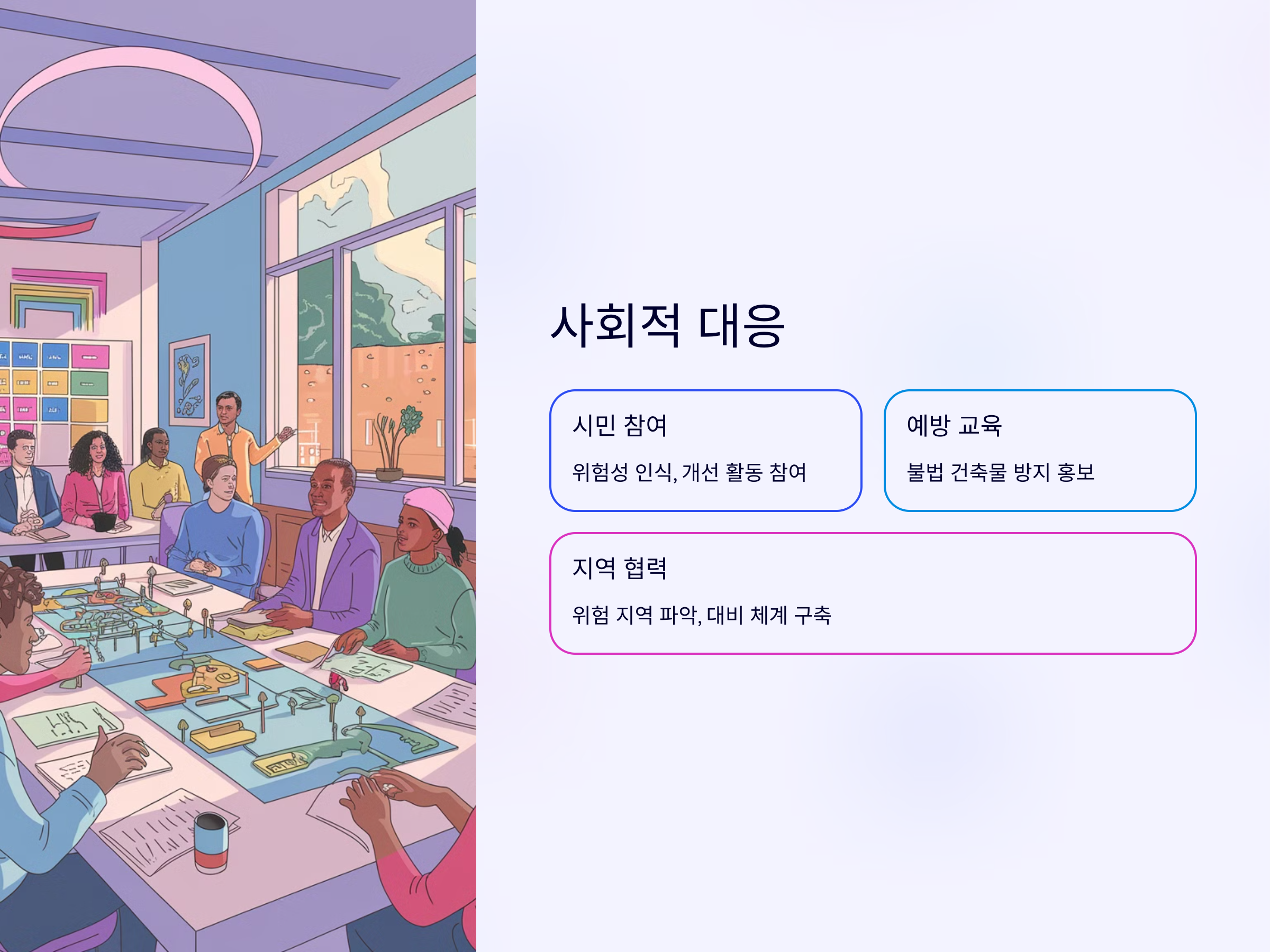 이를 위해서는 지역 사회와 함께 협력하여 불법 건축물이 일어날 가능성이 높은 지역을 파악하고, 미리 대비할 수 있는 체계를 구축해야 합니다. 또한, 지역 주민들에게는 불법 건축물의 위험성을 알리고, 이를 방지하기 위한 정책을 지속적으로 추진해야 합니다.