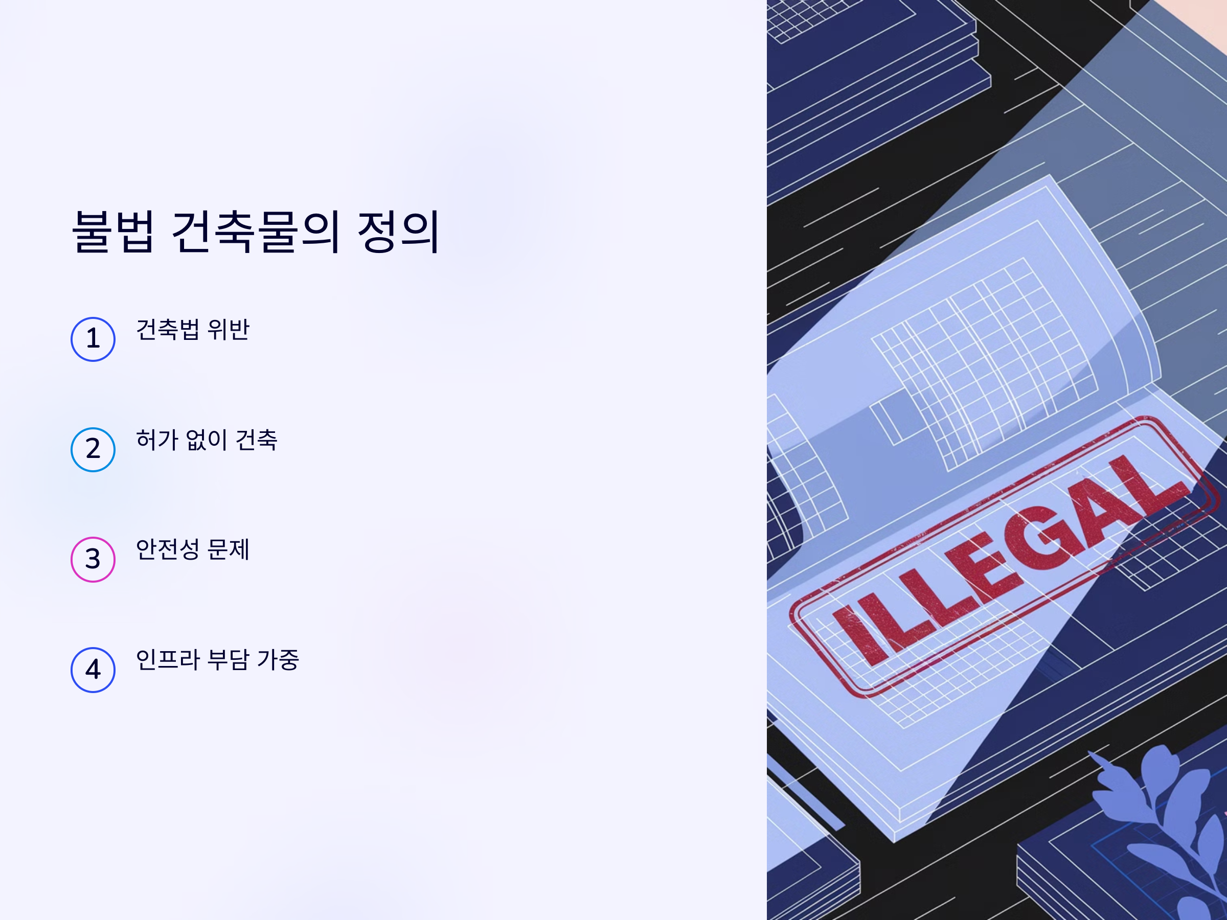 불법 건축물은 건축법, 도시계획법, 환경법 등을 위반하는 건축물로, 합법적으로 건축 허가를 받지 않고 지어진 구조물입니다. 이런 건축물은 건축물의 안전성이나 거주 환경에 심각한 문제를 일으킬 수 있습니다. 특히, 공공 인프라와의 관계에서 불법 건축물은 도로, 상수도, 하수도 등 기초 인프라의 과중한 부담을 가중시키며, 국가와 지방자치단체의 자원 낭비를 초래할 수 있습니다.