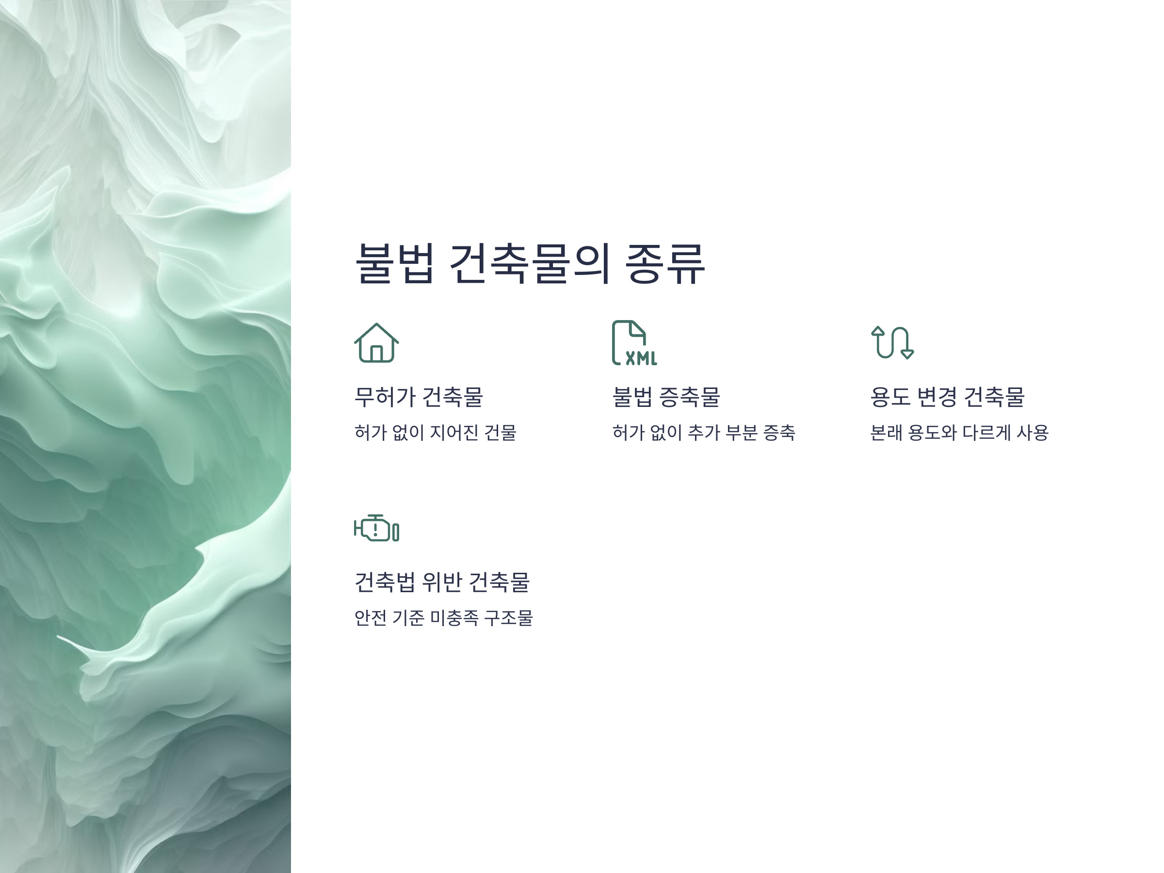 불법 건축물이란 단순히 허가를 받지 않은 건축물만을 의미하는 것이 아닙니다. 불법 건축물에는 여러 가지 유형이 존재합니다. 대표적으로는 다음과 같습니다.