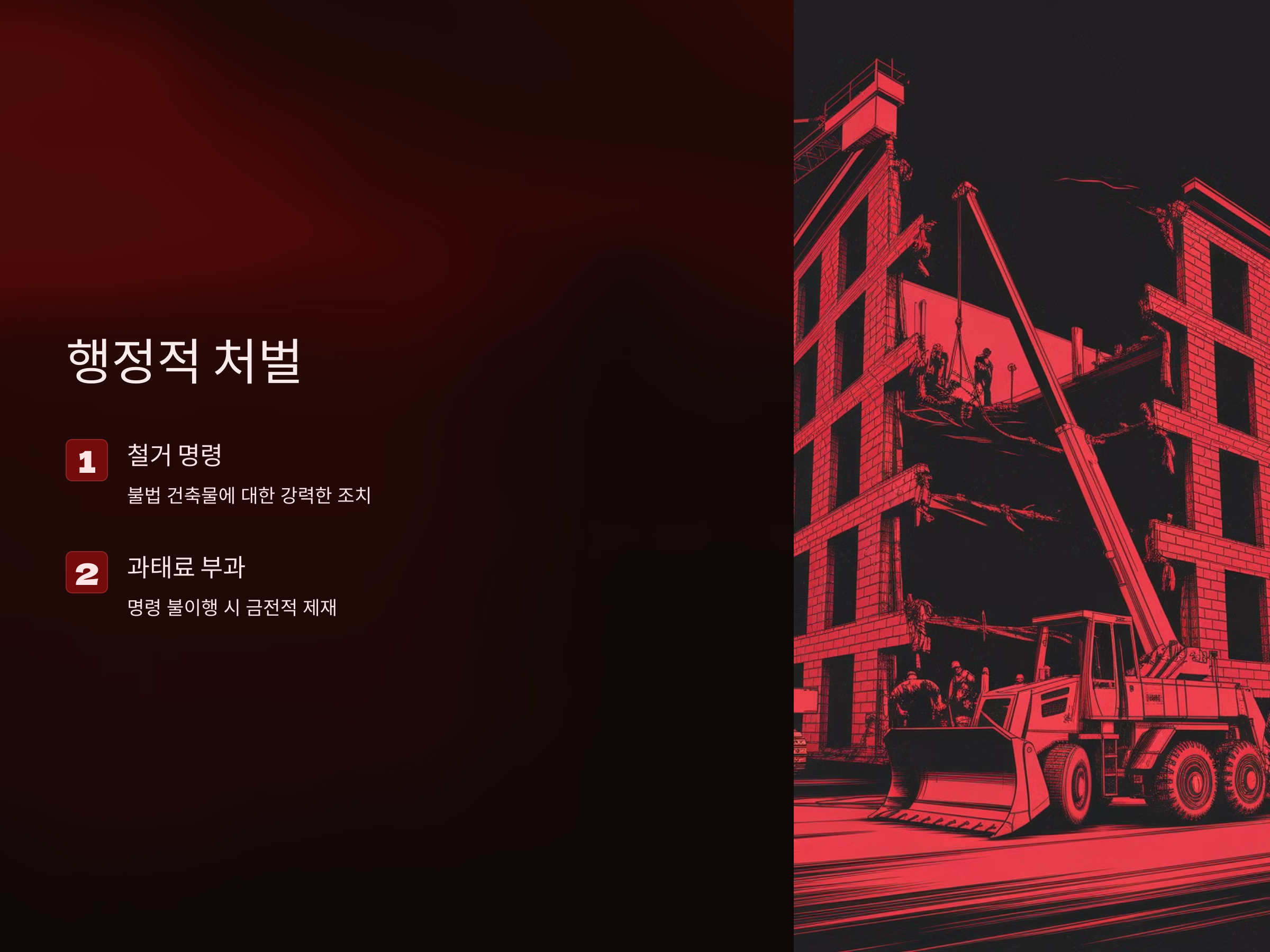 불법 건축물의 철거는 가장 강력한 행정적 처벌입니다. 건축물이 불법으로 지어진 것이 명백할 경우, 해당 건축물에 대해 철거 명령이 내려집니다. 철거 명령을 이행하지 않으면 과태료가 부과될 수 있으며, 재차 명령을 위반할 경우 더 큰 법적 처벌을 받을 수 있습니다.