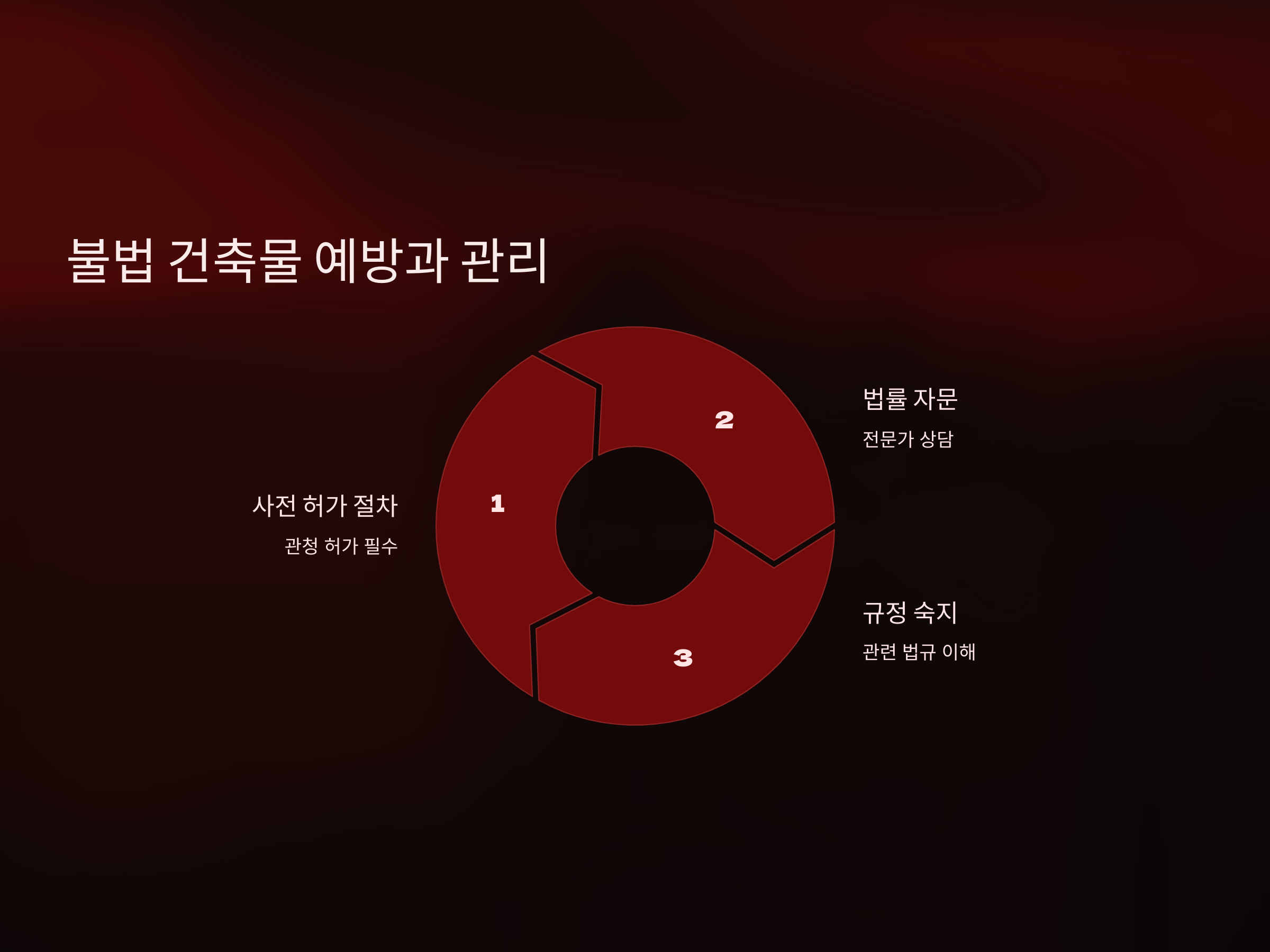 불법 건축물 문제를 예방하기 위해서는 사전 검토와 철저한 관리가 필요합니다. 건축물을 계획하고 시공하기 전에 반드시 관련 법규를 숙지하고, 필요한 허가를 받아야 합니다.