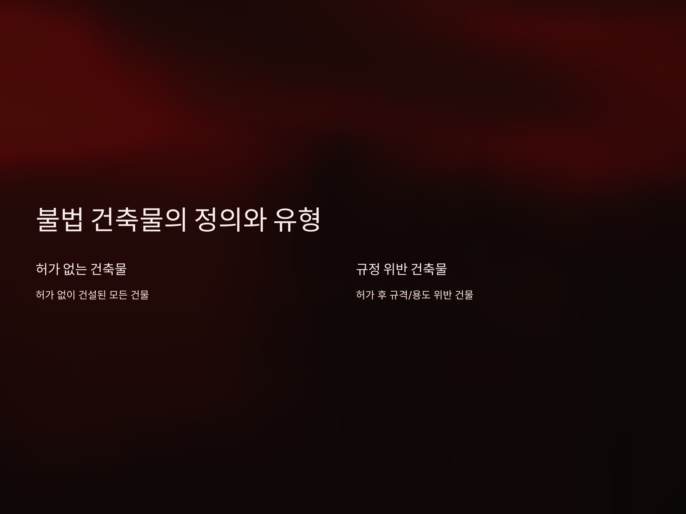 불법 건축물은 크게 두 가지로 나눌 수 있습니다. 첫째, 허가를 받지 않고 지은 건축물, 둘째, 허가를 받은 후 규격이나 용도를 위반한 건축물입니다. 이들은 모두 불법 건축물로 간주되며, 이에 대한 법적 처벌을 받게 됩니다.