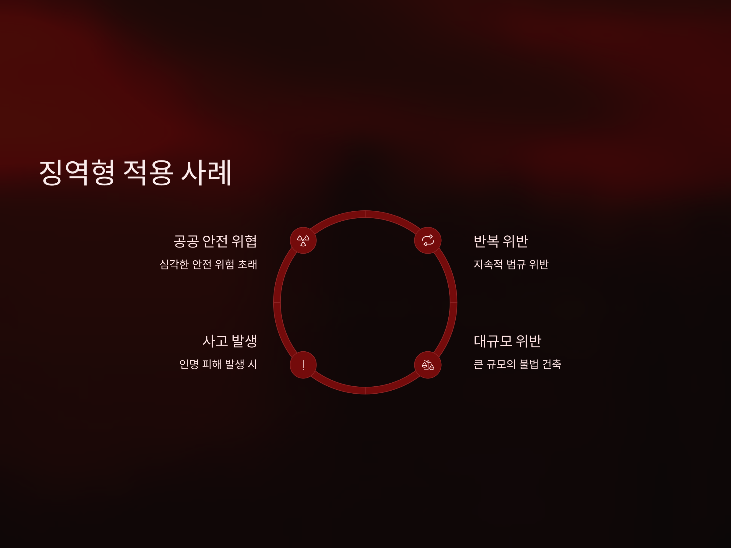 불법 건축물에 대한 처벌은 벌금뿐만 아니라 징역형으로도 이어질 수 있습니다. 징역형은 일반적으로 불법 건축물의 규모나 그로 인한 안전사고 발생 가능성에 따라 부과됩니다. 예를 들어, 불법 건축물이 공공의 안전을 심각하게 위협하거나, 건축물의 구조상 문제로 대형 사고가 발생할 가능성이 있는 경우, 해당 건축물의 소유자는 징역형을 받을 수 있습니다.