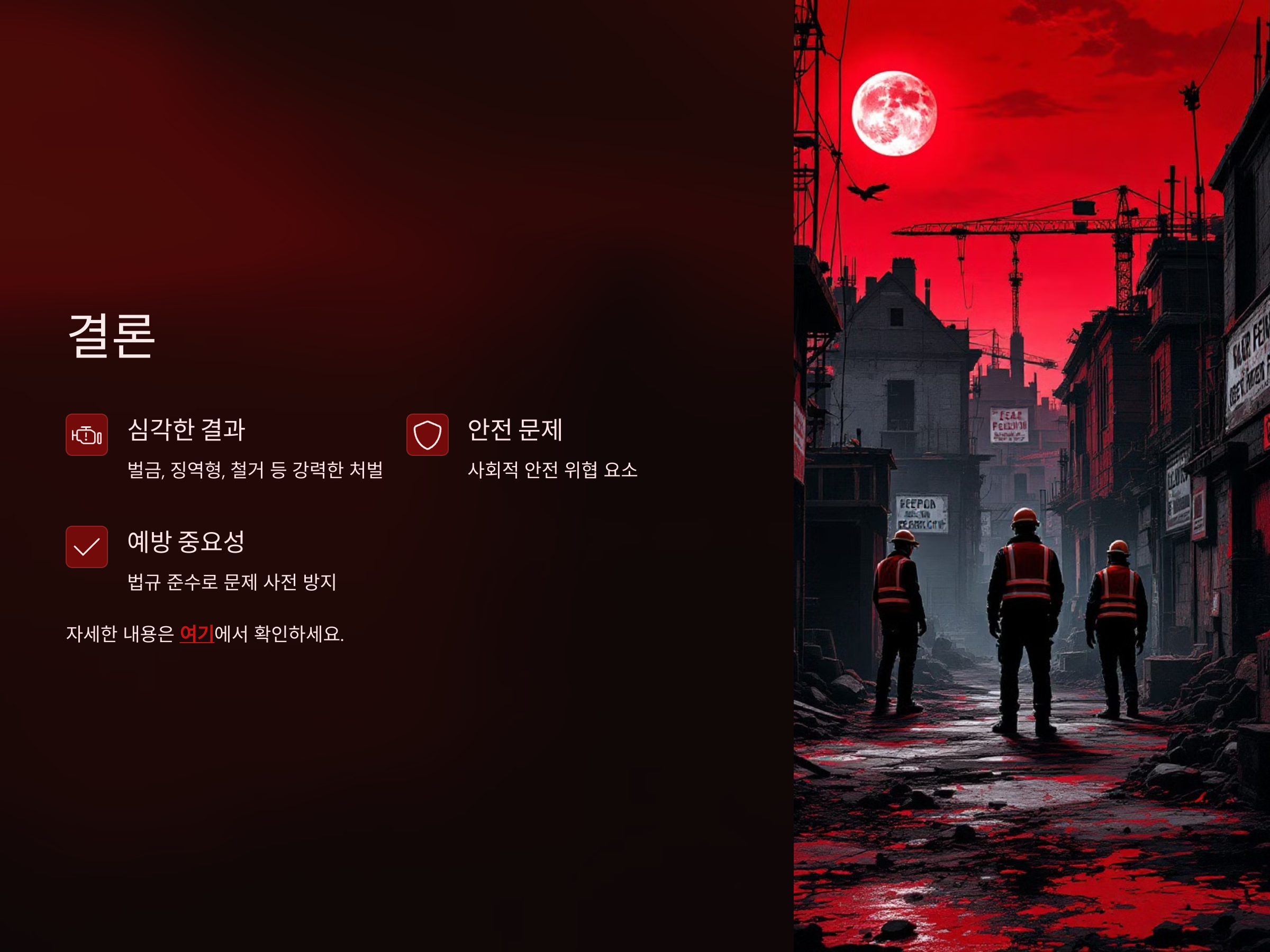 불법 건축물은 단순히 건축물의 불법적인 요소뿐만 아니라, 안전사고와 사회적인 문제를 야기할 수 있는 중요한 문제입니다. 이에 대한 처벌은 법적으로 매우 강력하며, 벌금과 징역형이 모두 적용될 수 있습니다. 따라서 건축을 진행하는 모든 사람들은 관련 법률을 충분히 이해하고, 불법 건축물로 인한 처벌을 피할 수 있도록 주의해야 합니다. 불법 건축물에 대한 예방과 대응 방법을 정확히 알고 이를 실천하는 것이 매우 중요합니다.