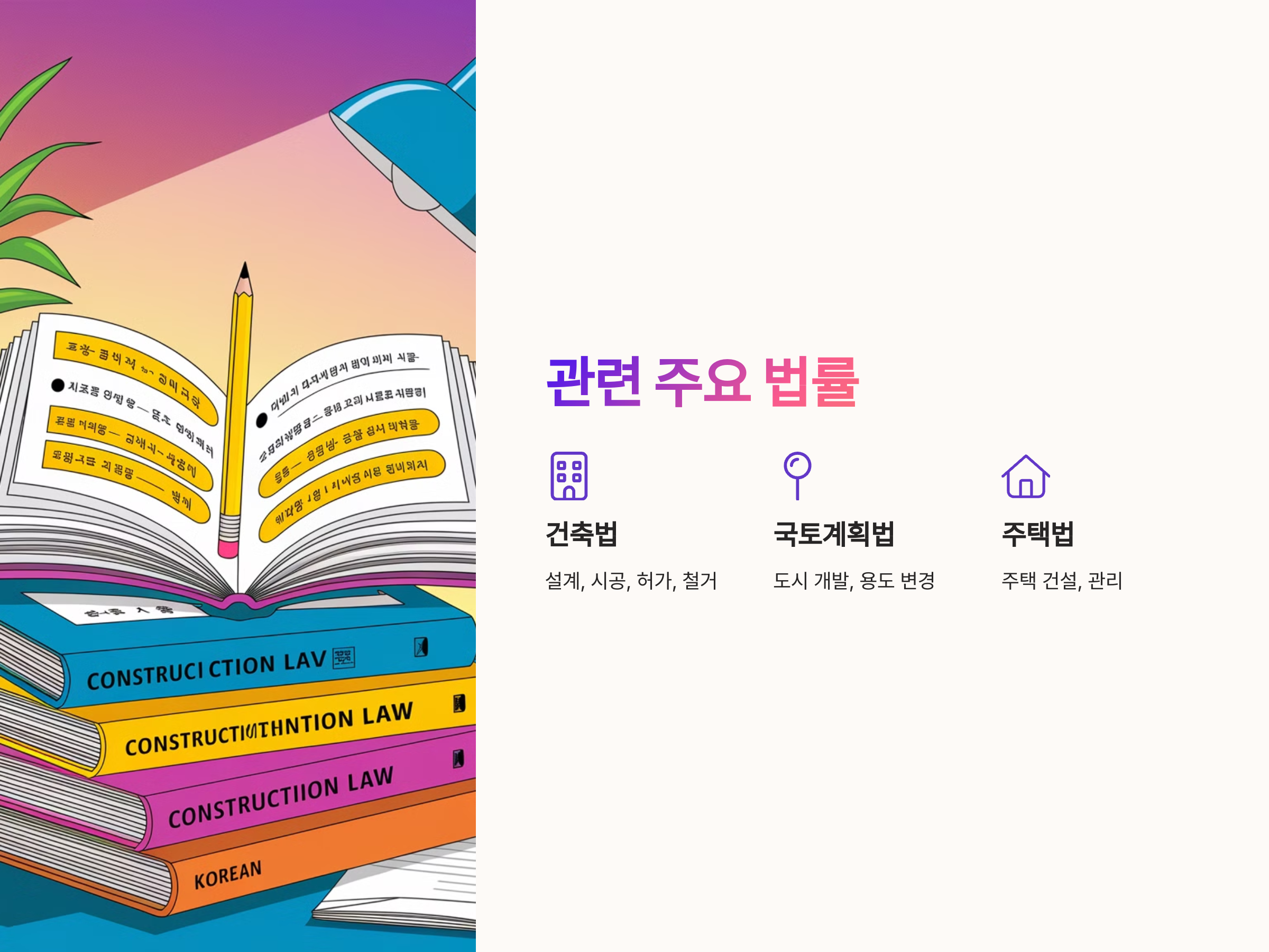 - 건축법: 건축물의 설계, 시공, 허가, 철거 등에 관한 법률