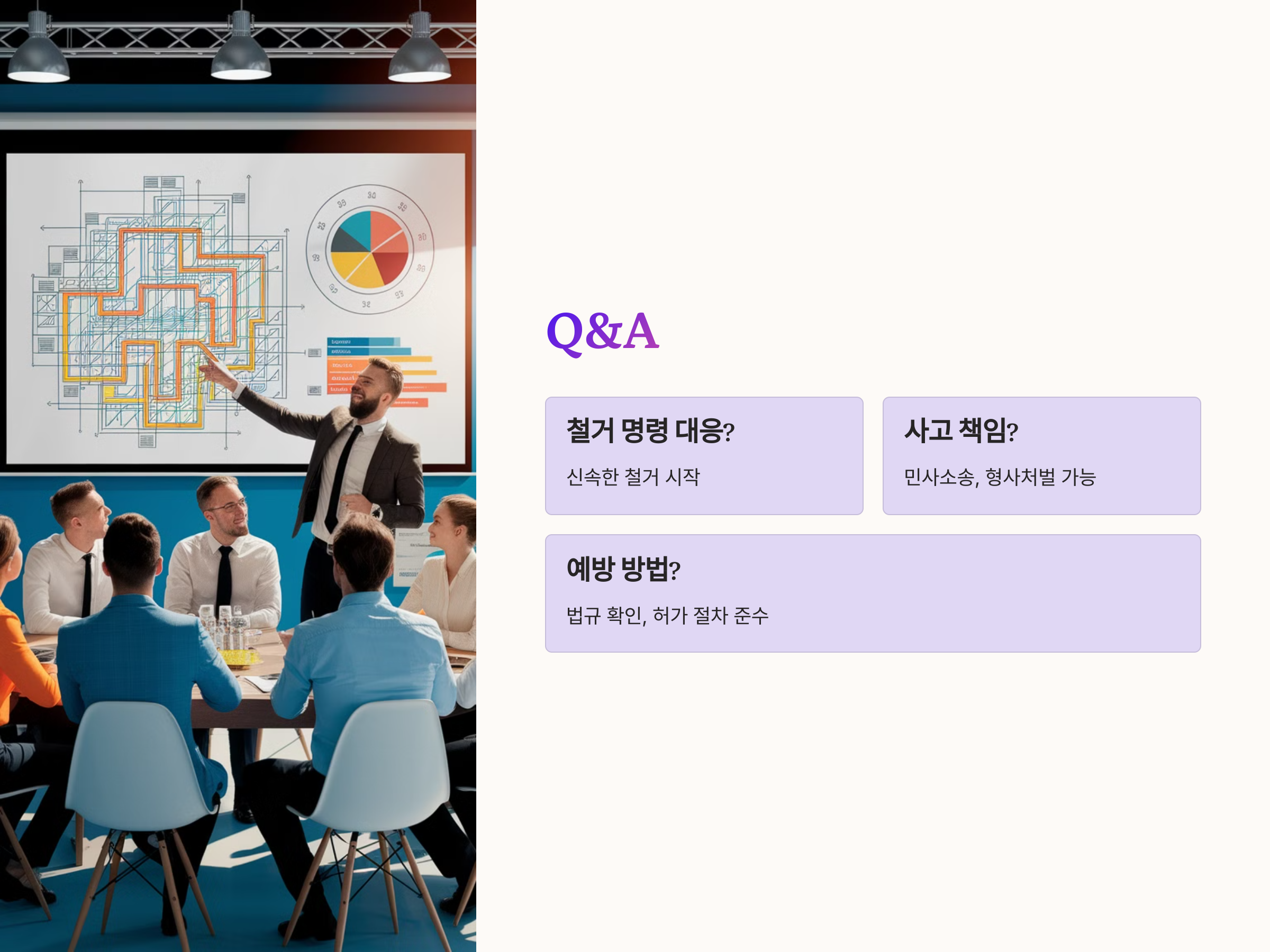 A1: 철거 명령을 받으면, 가능한 빨리 철거를 시작하는 것이 중요합니다. 철거를 미루면 과태료가 부과되거나 법적 처벌을 받을 수 있습니다.