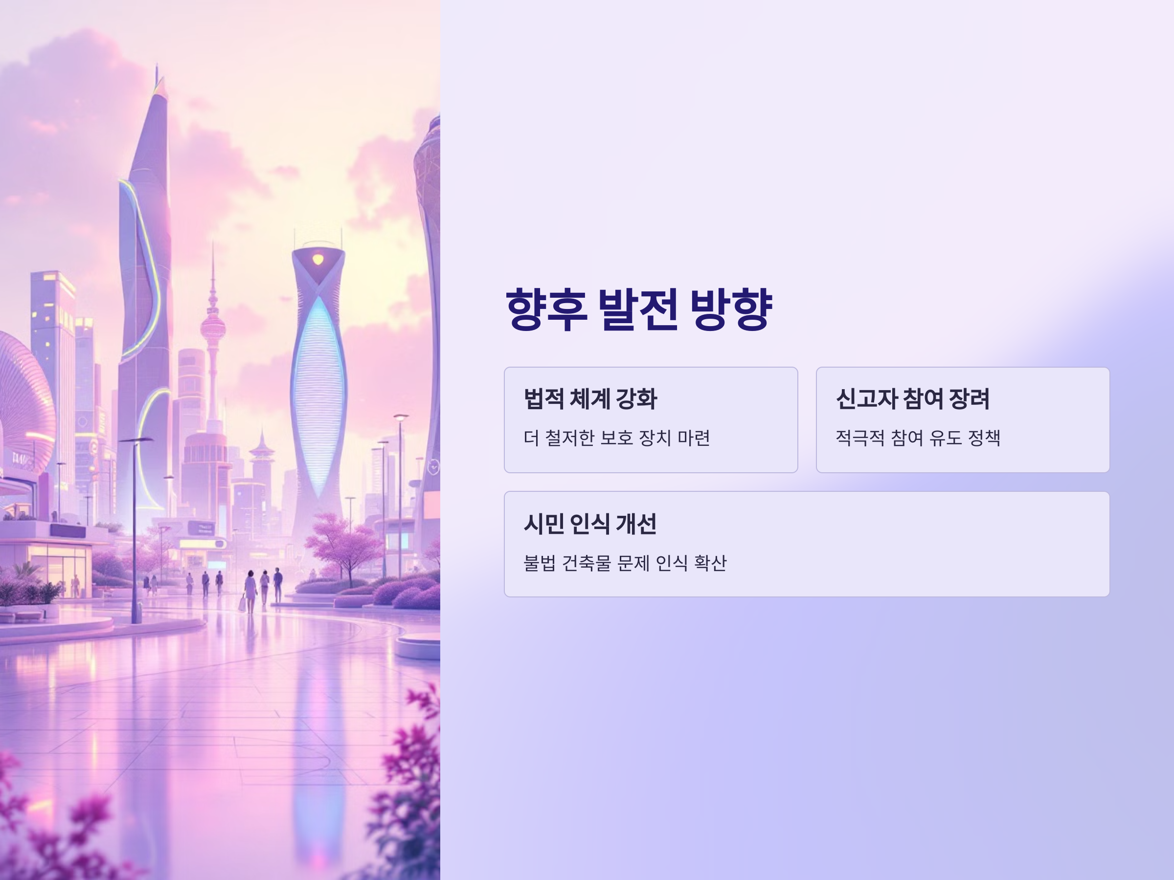 이 제도는 신고자가 안전하게 신고할 수 있는 환경을 제공하여, 신고자들의 적극적인 참여를 유도합니다. 불법 건축물 문제는 그 자체로 사회적 안전을 위협하는 요소이기 때문에, 이를 해결하기 위한 신고 활성화가 필수적입니다. 신고자들이 두려움 없이 신고할 수 있다면, 불법 건축물의 발견 및 처리가 더욱 신속하고 효율적으로 이루어질 것입니다.