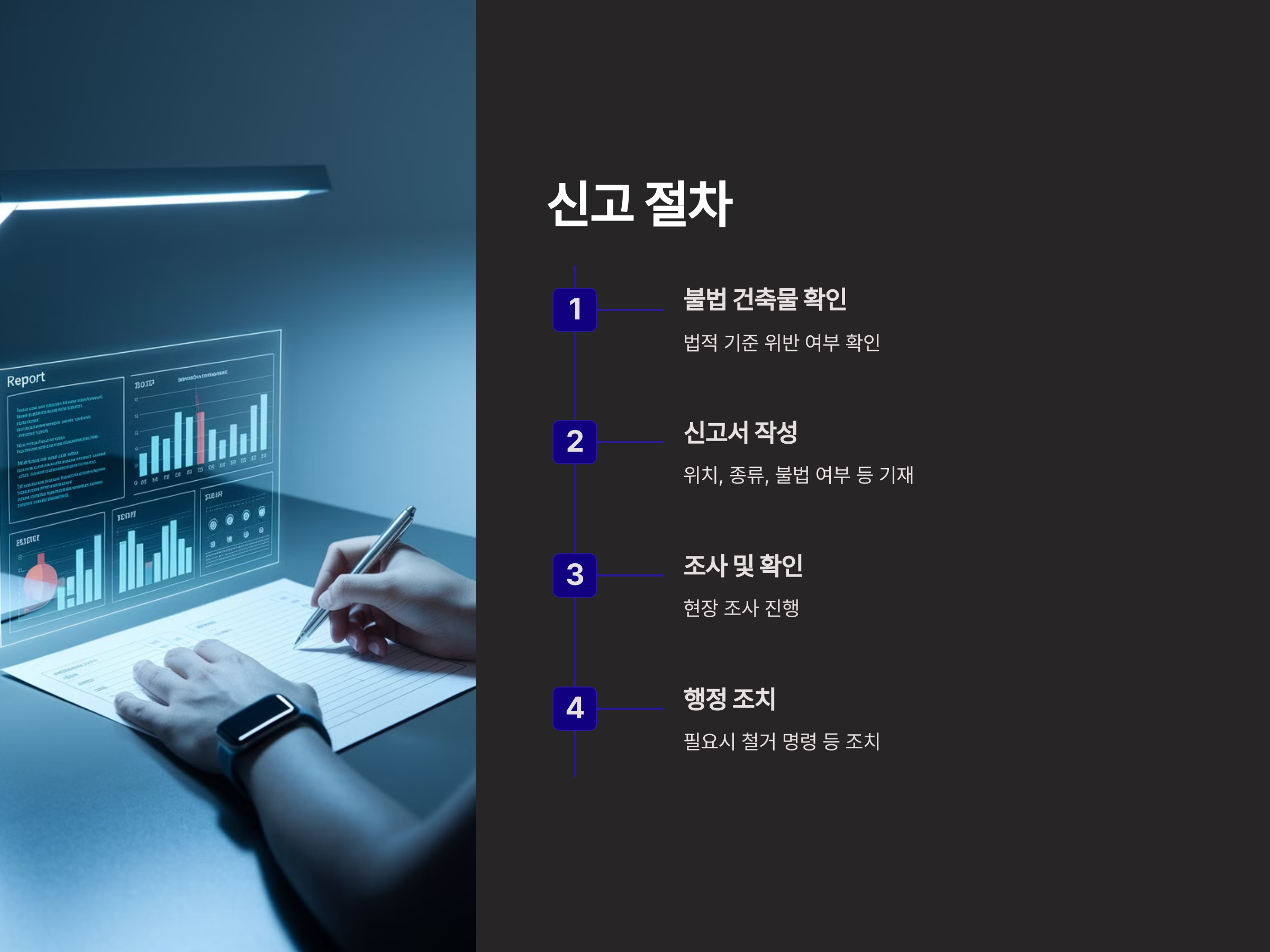 신고자는 건축물의 위치, 건축물의 종류, 불법 여부 등을 포함한 신고서를 작성하여 제출해야 합니다. 이 때, 건축물 사진이나 관련 증거를 첨부하는 것이 좋습니다.