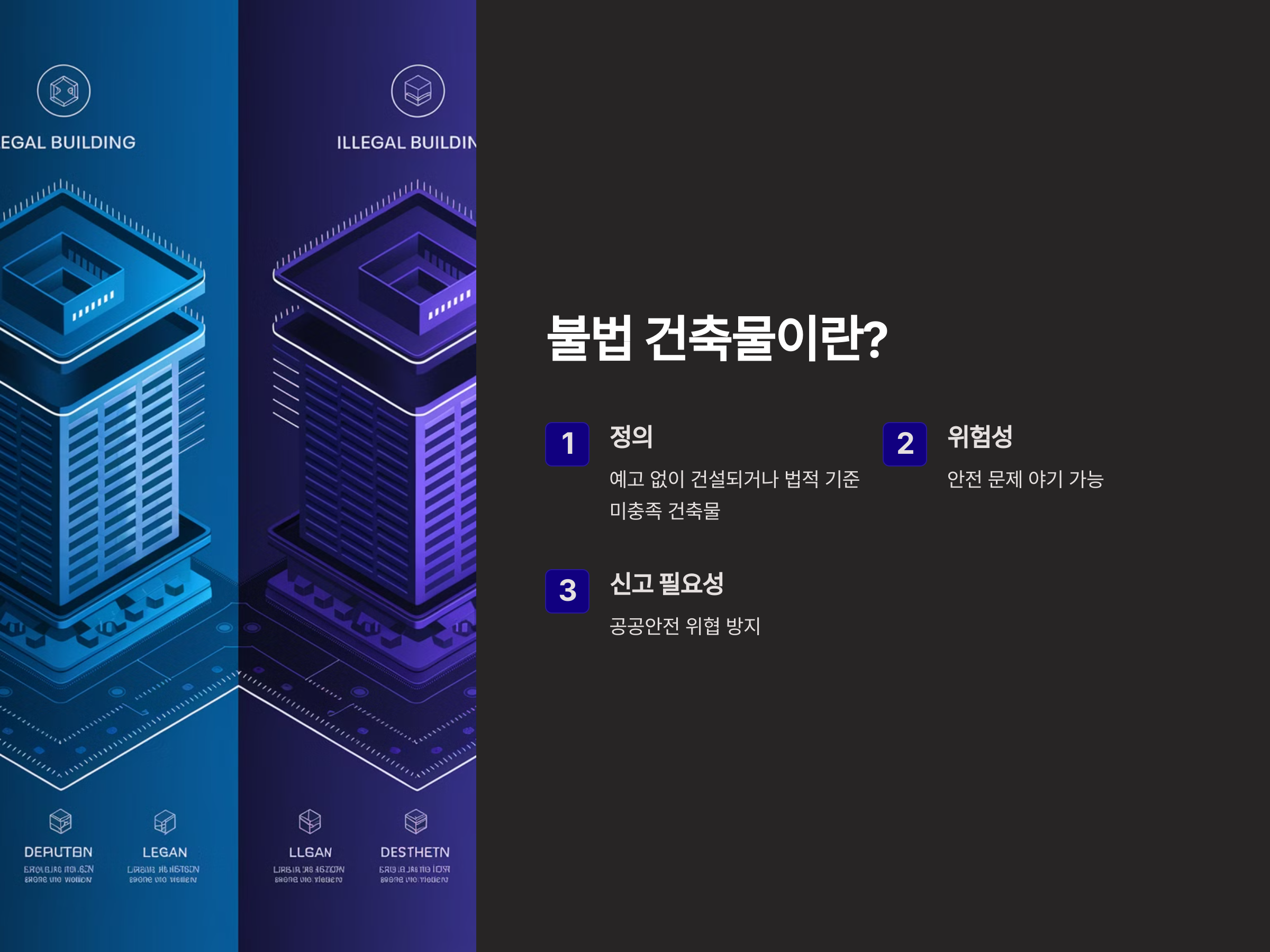 불법 건축물은 예고 없이 건설되거나 법적 기준을 충족하지 못하는 건축물을 의미합니다. 이러한 건축물은 종종 안전 문제를 야기할 수 있기 때문에 신고가 필수적입니다. 불법 건축물 신고는 해당 지역의 관련 기관을 통해 이루어지며, 신고자는 건축물에 대한 정보를 제공해야 합니다.