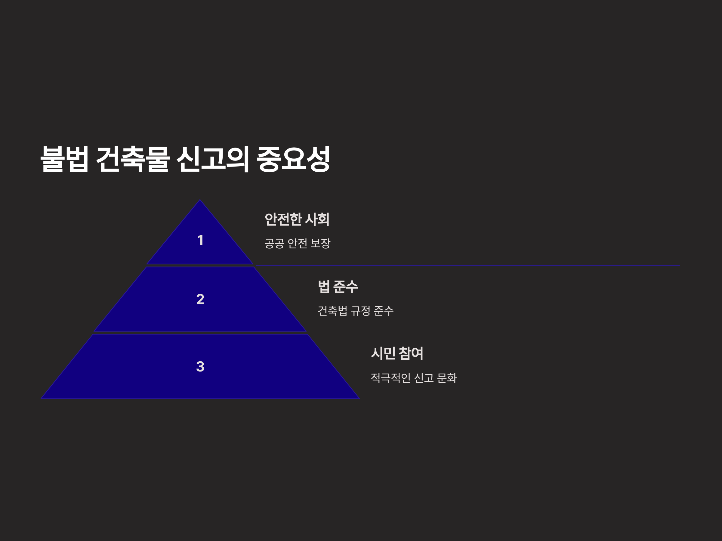 불법 건축물 신고는 공공의 안전을 지키는 중요한 역할을 합니다. 따라서 불법 건축물을 발견했을 때는 주저하지 말고 즉시 신고하는 것이 필요합니다.