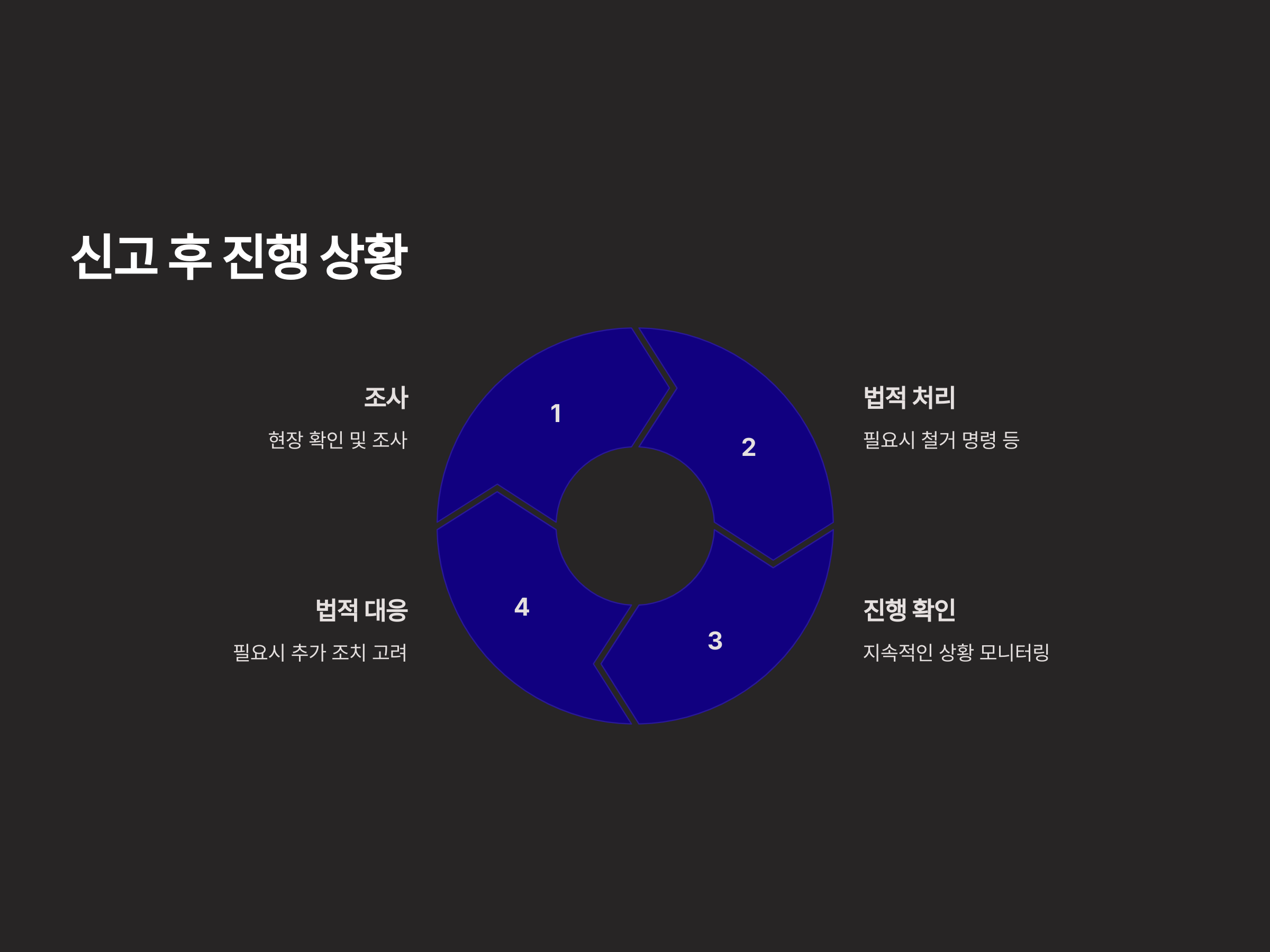 불법 건축물 신고 후 철거나 법적 처벌이 이루어지기까지는 시간이 걸릴 수 있습니다. 각 기관의 절차에 따라 진행됩니다.