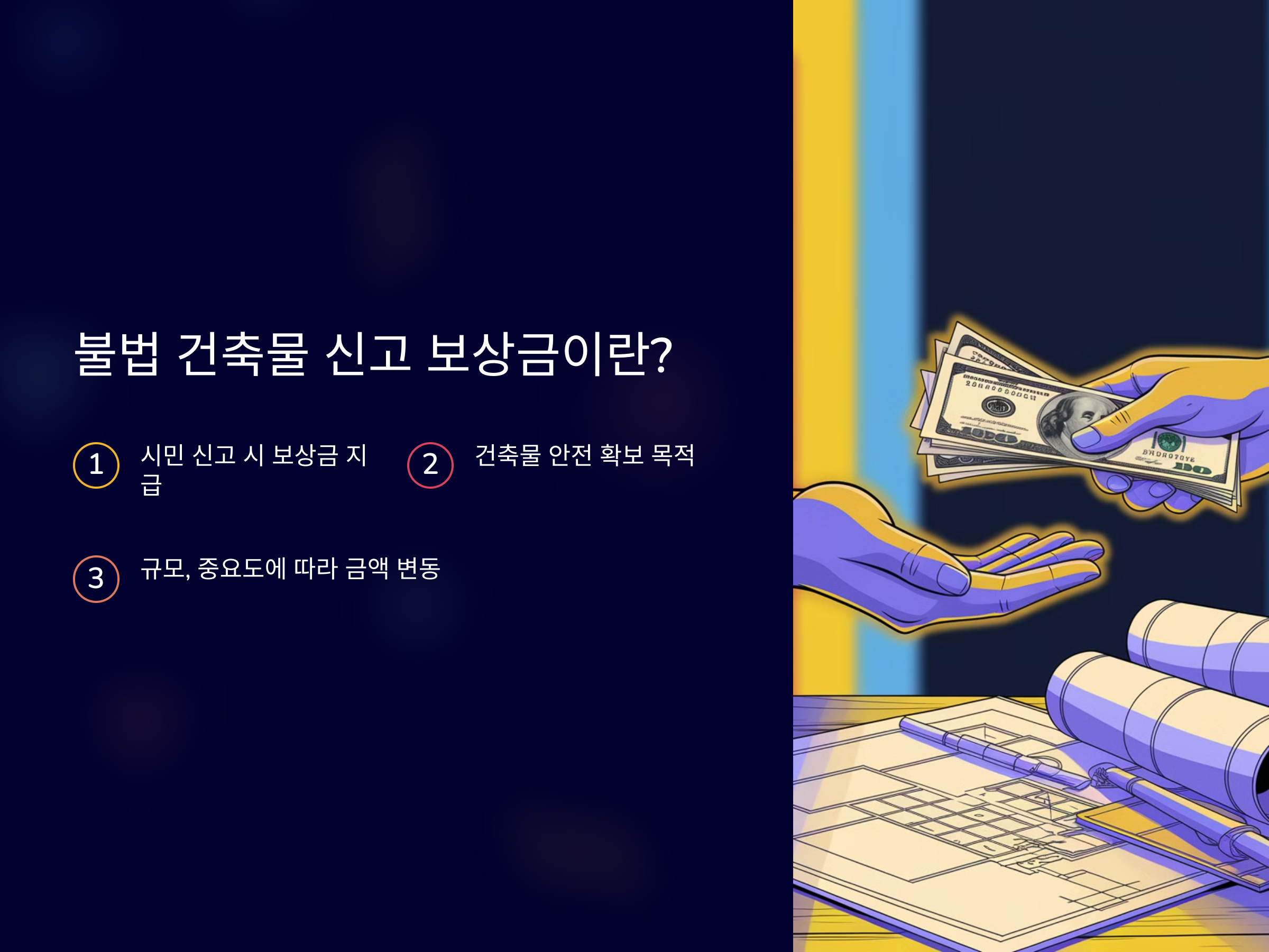 불법 건축물 신고 보상금 제도는 불법 건축물의 문제를 해결하는 중요한 방법이자, 시민에게 보상금을 지급하는 유용한 제도입니다. 정확한 신고 절차와 필요한 서류를 준비하여 보상금을 받을 수 있는 기회를 놓치지 않도록 하세요!