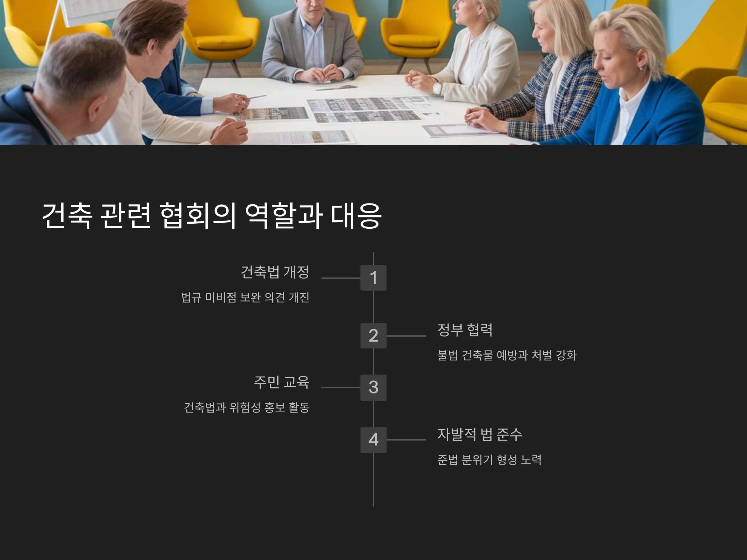 불법 건축물 문제를 해결하기 위해 건축 관련 협회들이 다양한 방법으로 대응하고 있습니다. 첫 번째로, 건축법 개정과 관련된 적극적인 의견 개진을 하고 있습니다. 불법 건축물이 늘어남에 따라, 건축 관련 법규나 정책의 미비점이 지적되기도 했습니다. 이에 따라, 건축 관련 협회는 정부와 협력하여 법과 규제를 보완하고 있으며, 이를 통해 불법 건축물에 대한 예방과 처벌을 강화하고 있습니다.