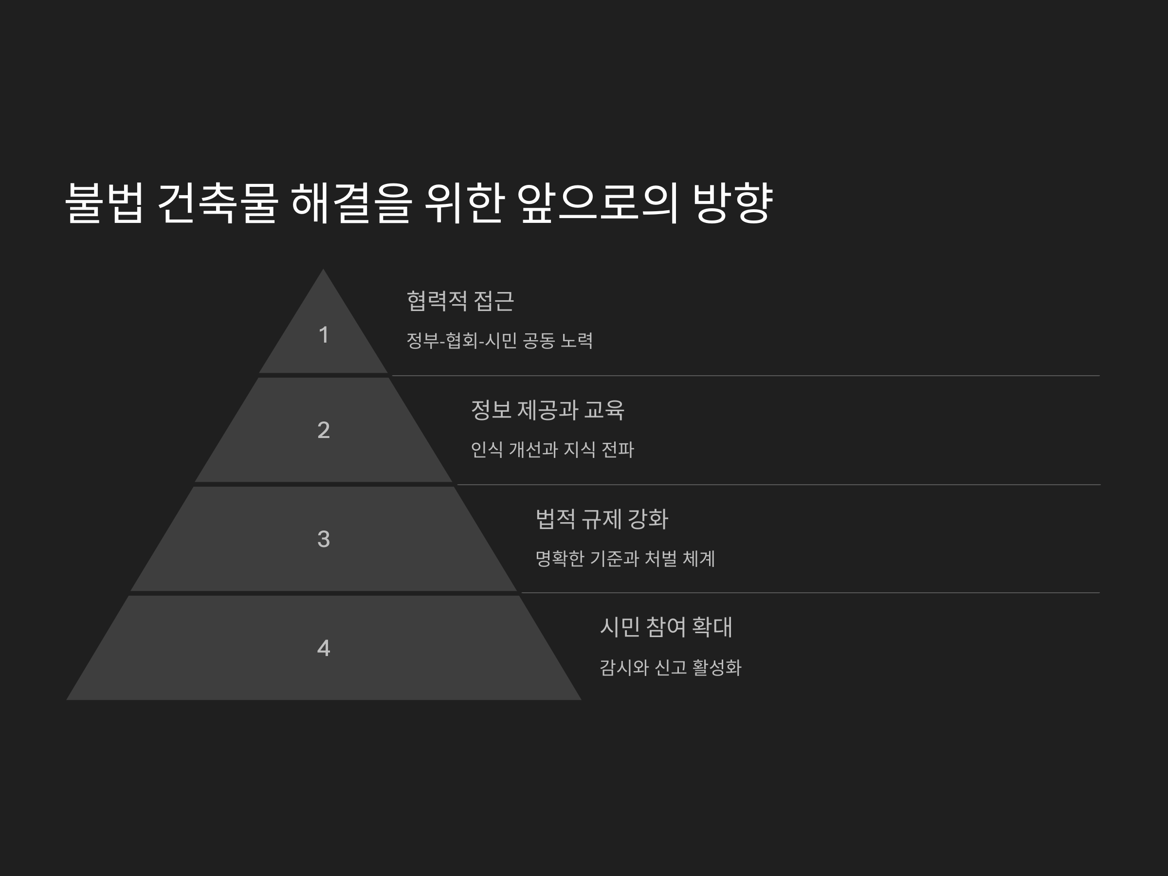 불법 건축물 문제를 해결하기 위한 앞으로의 방향은 협력적 접근이 중요합니다. 정부, 건축 관련 협회, 주민들이 서로 협력하여 불법 건축물의 발생을 최소화하고, 그로 인한 문제를 해결해 나가는 것이 필요합니다. 이를 위해서는 정보 제공과 교육, 법적 규제 강화, 시민 참여의 확대가 중요한 역할을 할 것입니다.