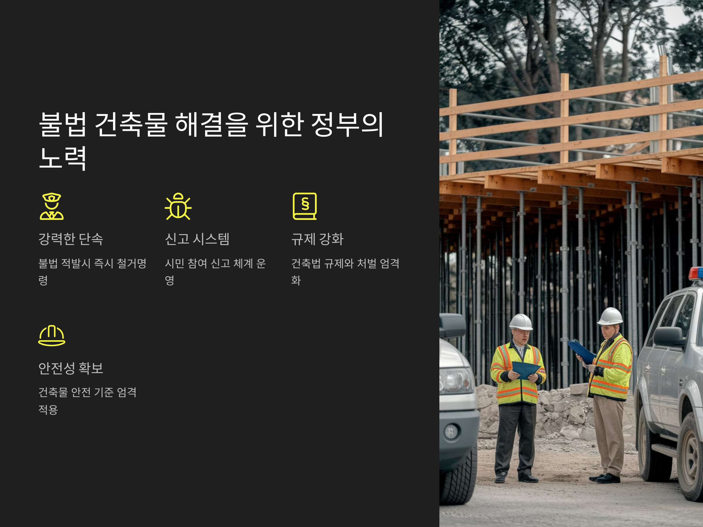 정부는 불법 건축물 문제를 해결하기 위해 다양한 노력을 기울이고 있습니다. 첫 번째로, 불법 건축물에 대한 강력한 단속을 강화하고 있습니다. 불법 건축물이 발견되면, 즉시 철거 명령을 내리고, 이를 이행하지 않을 경우 법적 제재를 가하는 방식으로 대응하고 있습니다. 또한, 불법 건축물 신고 시스템을 운영하여, 시민들이 불법 건축물을 쉽게 신고할 수 있도록 하고 있습니다.