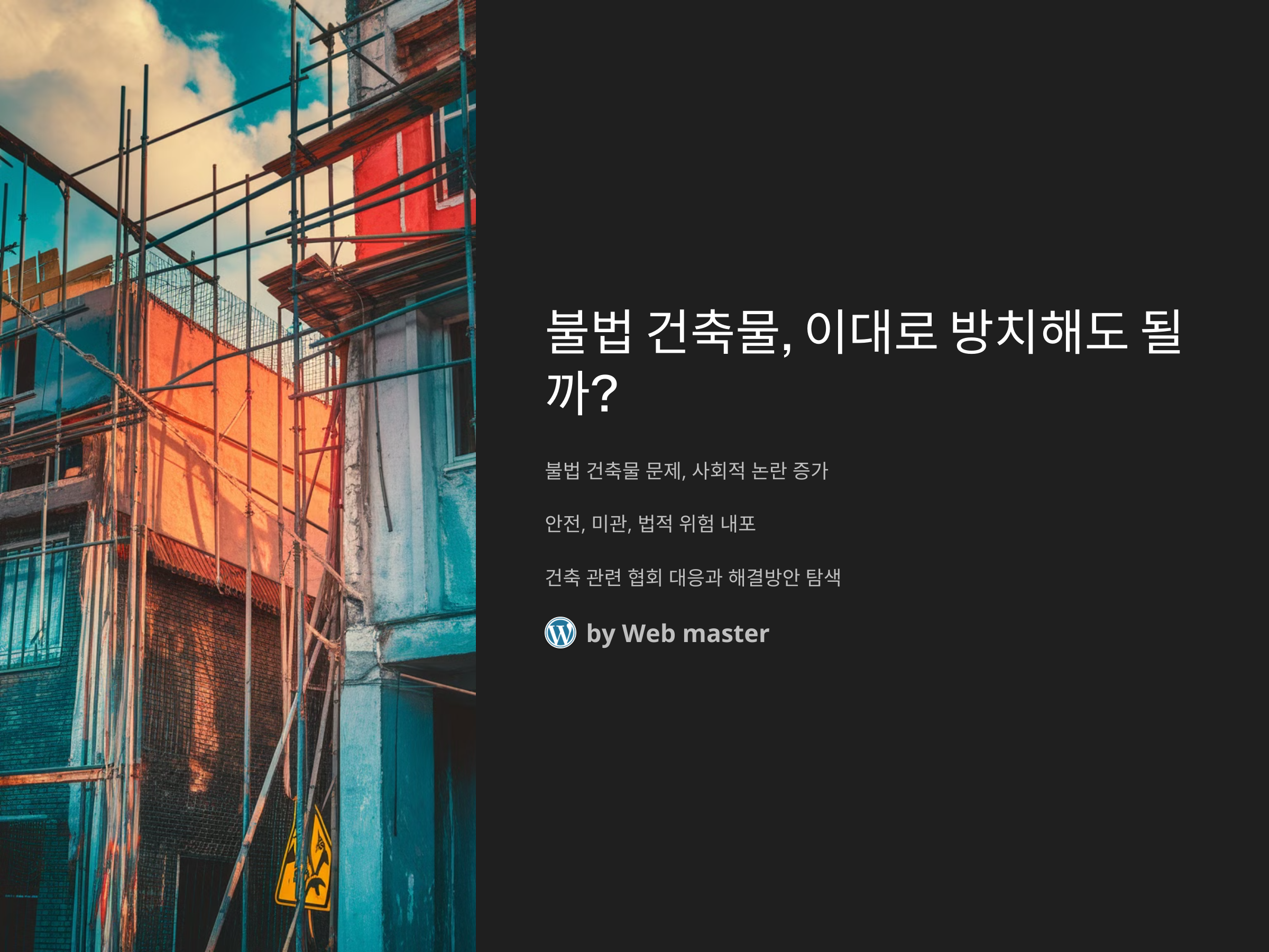 이러한 불법 건축물들은 다양한 문제를 야기합니다. 첫 번째로, 안전 문제가 있습니다. 불법으로 지어진 건축물은 건축법을 준수하지 않기 때문에 구조적으로 불안정하거나, 화재 발생 위험이 큽니다. 또한, 사회적 불편을 초래하기도 합니다. 불법 건축물이 늘어날수록, 도시의 정체성이나 미관에 영향을 미치고, 도시 관리의 어려움을 증가시키게 됩니다.