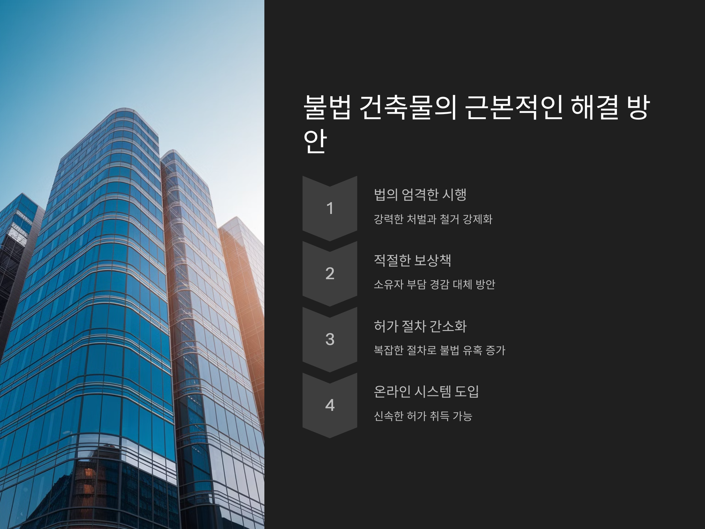 불법 건축물 문제를 해결하기 위해서는 단기적인 해결책 외에도 근본적인 해결 방안이 필요합니다. 가장 중요한 것은 법의 엄격한 시행입니다. 불법 건축물에 대해 더 강력한 처벌을 내리고, 기존에 지어진 불법 건축물에 대해서는 철거나 수리를 강제하는 법적 근거를 강화하는 것이 필요합니다. 그러나 이는 건축물의 소유자에게 큰 부담이 될 수 있기 때문에, 적절한 보상책이나 대체 방안을 마련해야 합니다.