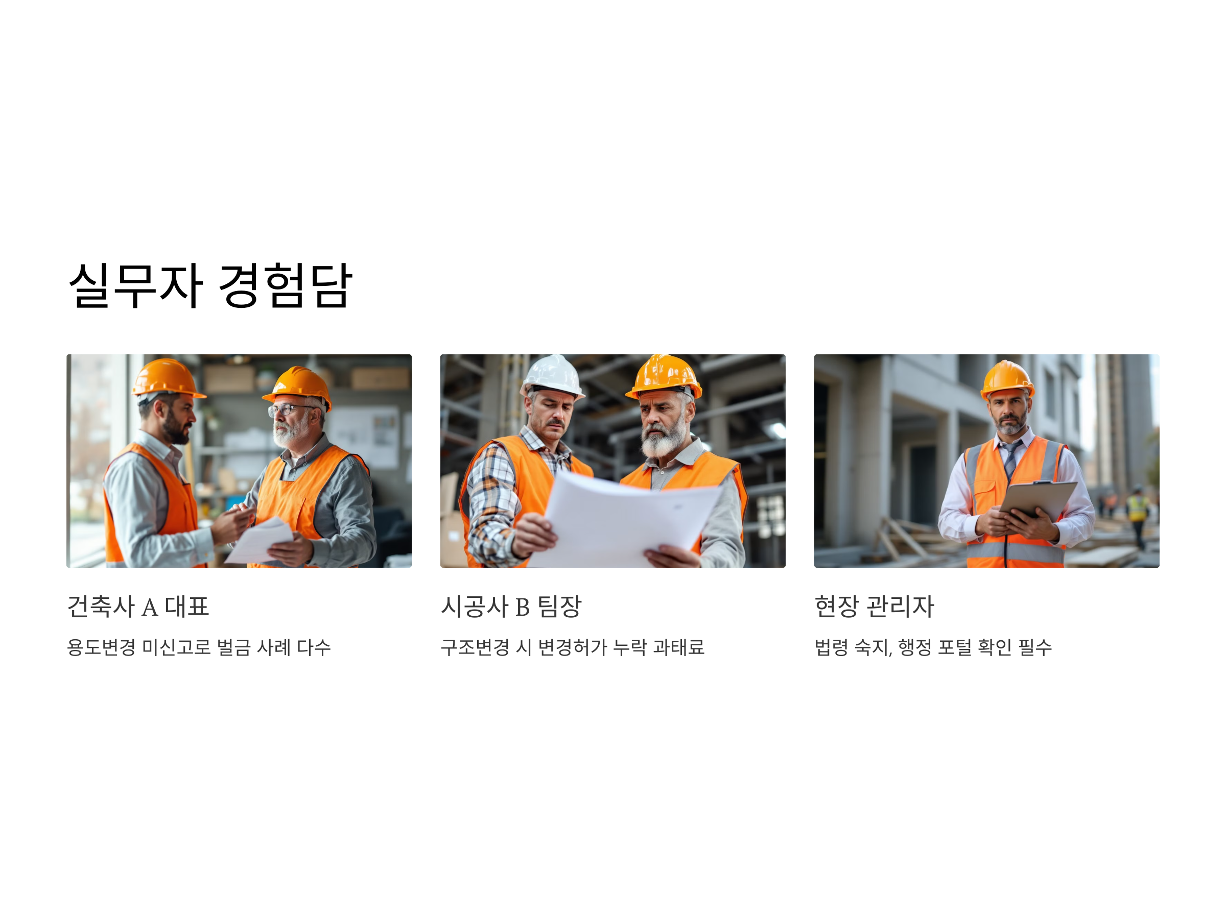 건축사무소 A 대표는 “최근 상가 건물 리모델링 시, 구청에서 용도변경 미신고로 벌금을 부과받은 사례가 많았다”며 “현행법에 대한 이해와 적극적인 행정 상담이 중요하다”고 전했습니다. 시공사 B 팀장은 “허가 후에도 구조 변경 시 반드시 변경허가를 받아야 한다는 점을 놓쳐, 추가 과태료를 낸 경우가 있었다”고 덧붙였습니다.