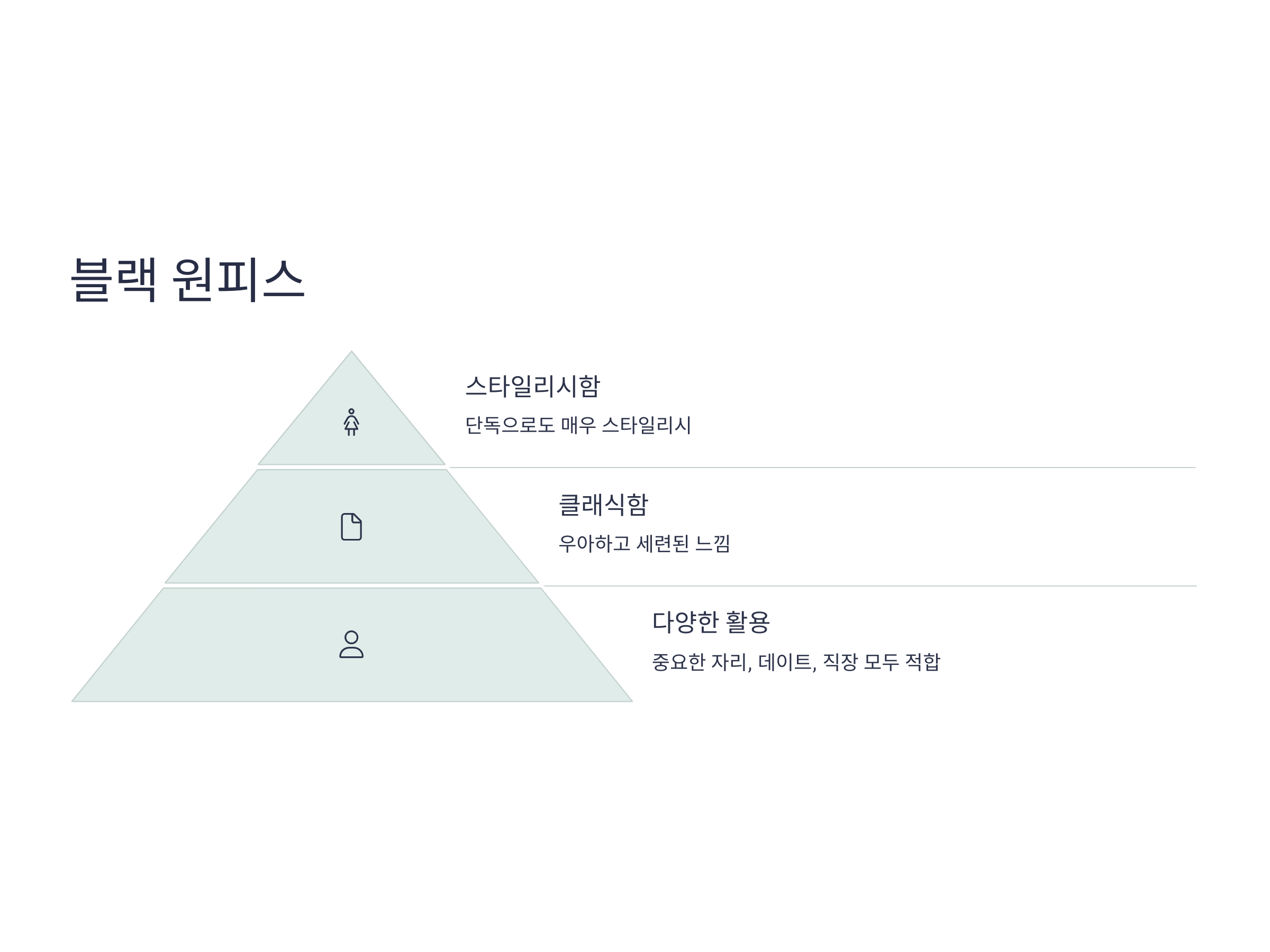 블랙 원피스는 모든 여성들이 갖추어야 할 아이템으로, 단독으로 입기에도 매우 스타일리시하고, 적당히 포멀한 자리에도 잘 어울립니다. 블랙 원피스는 클래식하고 우아한 느낌을 주며, 액세서리나 신발로 개성을 더할 수 있는 아이템입니다. 특히 중요한 자리나 데이트, 혹은 직장에서도 입을 수 있어 실용적인 의류로 추천합니다.