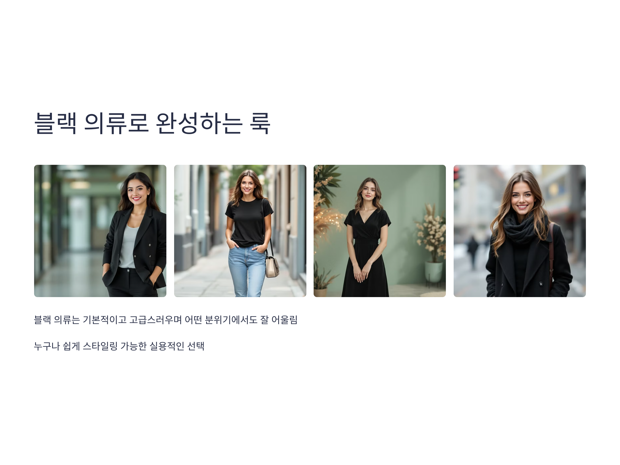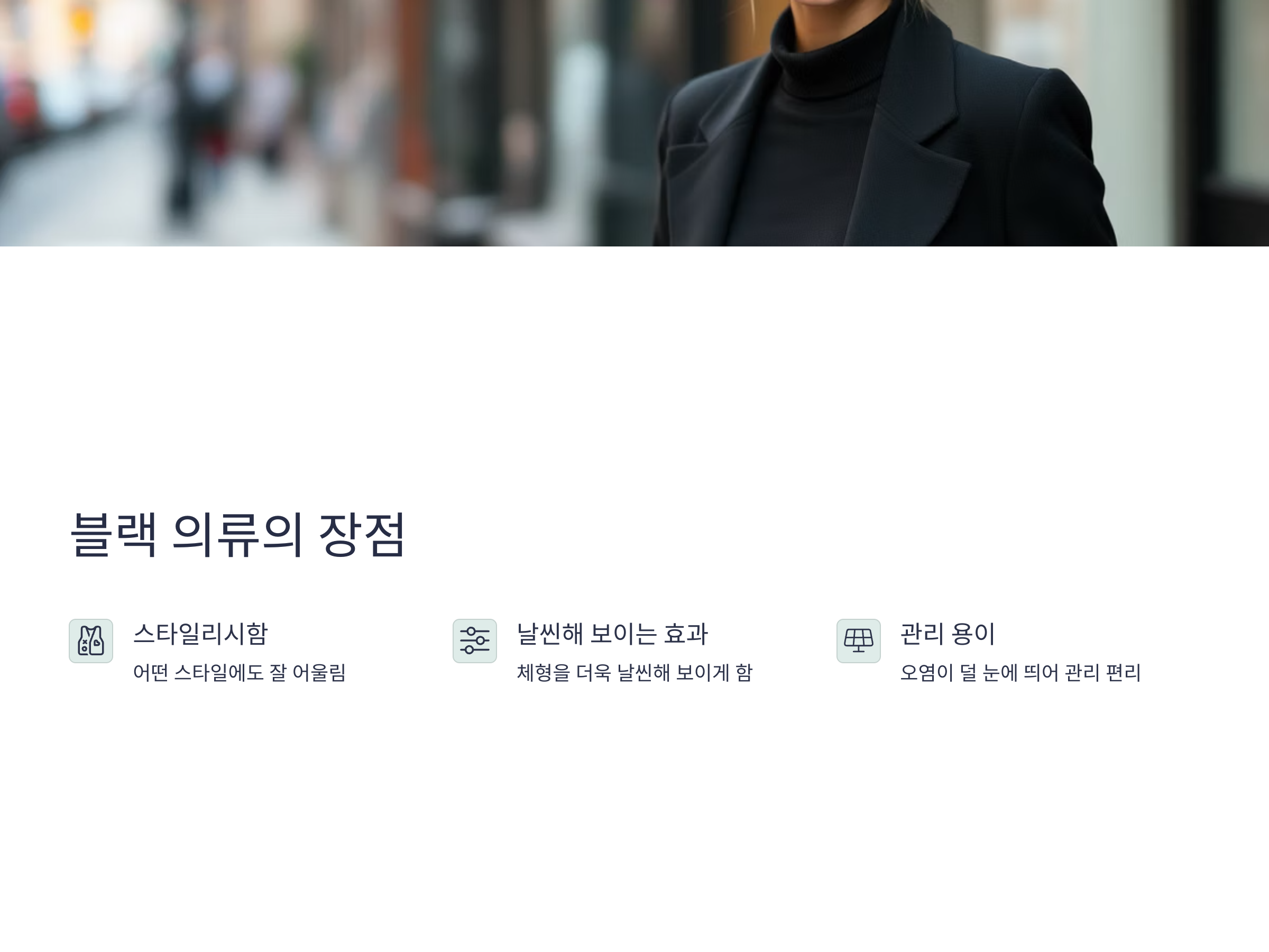 블랙 의류의 장점은 무엇보다도 '다양한 조합'이 가능하다는 것입니다. 블랙 색상 자체는 기본적이고 고급스러우며, 어떤 분위기에서도 잘 어울리기 때문에 누구나 쉽게 스타일링할 수 있습니다. 이 점이 블랙 의류의 가장 큰 매력 중 하나입니다.