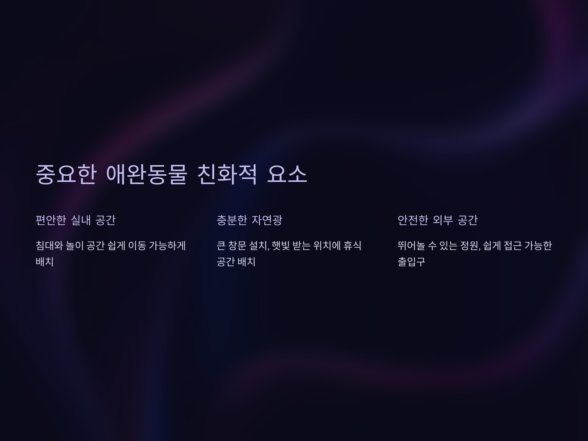 첫째, 애완동물이 충분히 뛰어놀 수 있는 공간을 확보해야 합니다. 넓은 실내와 야외 공간을 적절히 배치하여 애완동물이 자유롭게 활동할 수 있도록 해줍니다. 둘째, 실내의 환경을 안전하게 설계해야 합니다. 예를 들어, 유리창의 모서리를 둥글게 처리하거나, 애완동물이 자주 지나가는 공간에는 미끄럼 방지 처리를 해주는 것이 좋습니다. 셋째, 애완동물의 화장실과 같은 필수적인 시설을 손쉽게 접근할 수 있도록 배치해야 합니다.