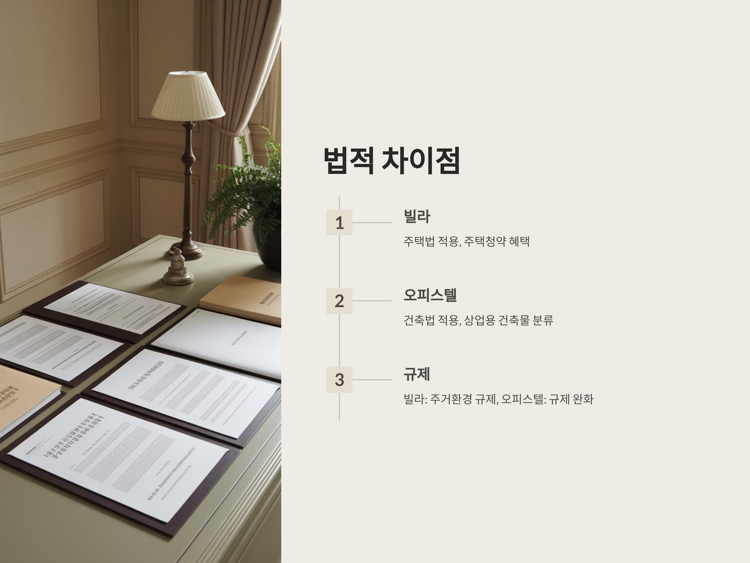 빌라와 오피스텔의 법적 차이점은 굉장히 중요합니다. 빌라는 주택법에 의한 주거지로 취급되며, 이를 기반으로 세금이나 대출이 결정됩니다. 특히, 주거용 건물로 인정되기 때문에 주택청약과 관련된 혜택을 받을 수 있다는 장점이 있습니다. 또한, 전세나 월세 계약이 가능하고, 주거환경이 규제 받는 경우가 많습니다.