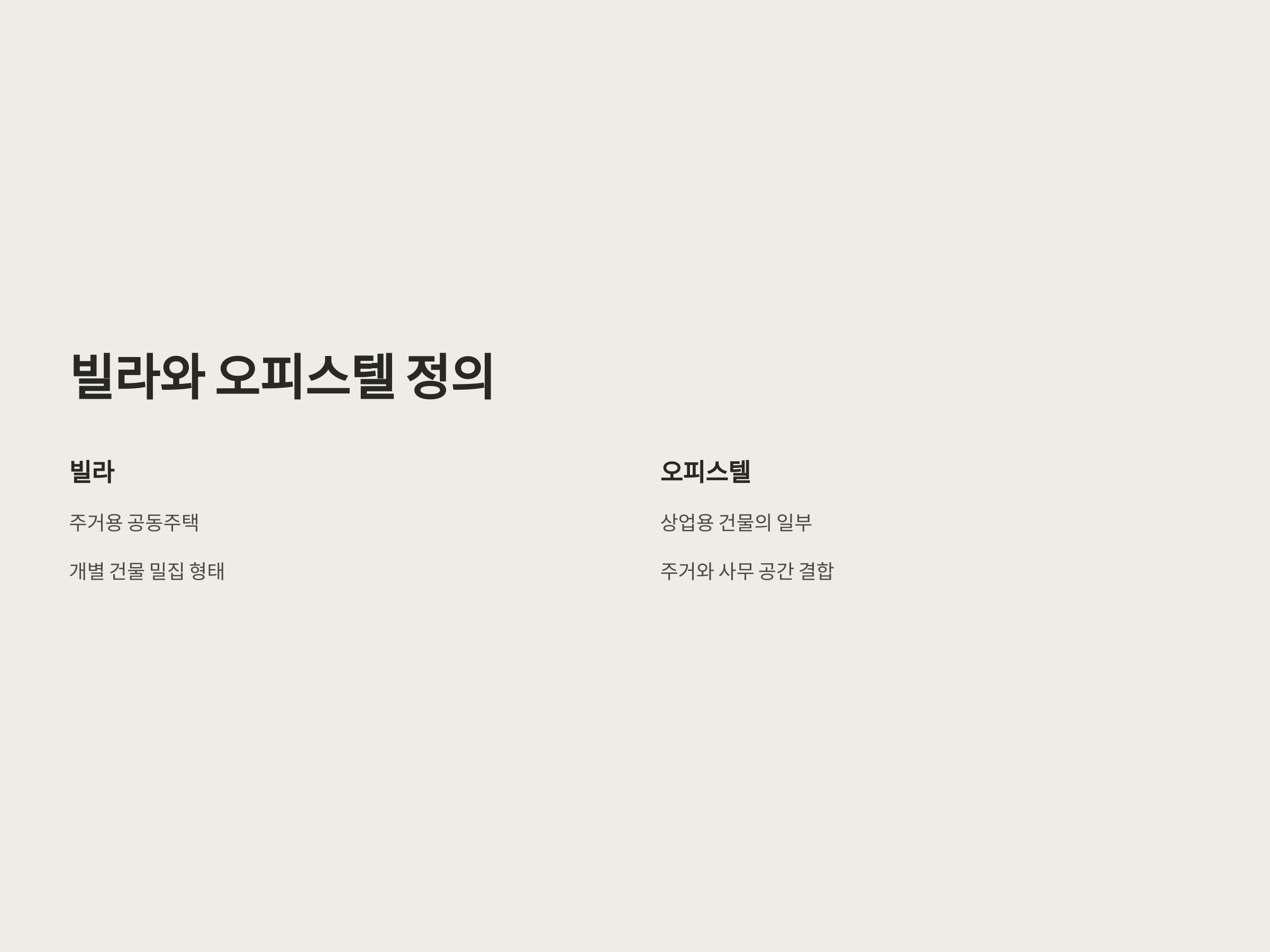 우리가 흔히 사용하는 빌라와 오피스텔, 한 번에 구별하기 어려운 경우가 많습니다. 우선, 둘의 기본적인 정의부터 살펴보죠.