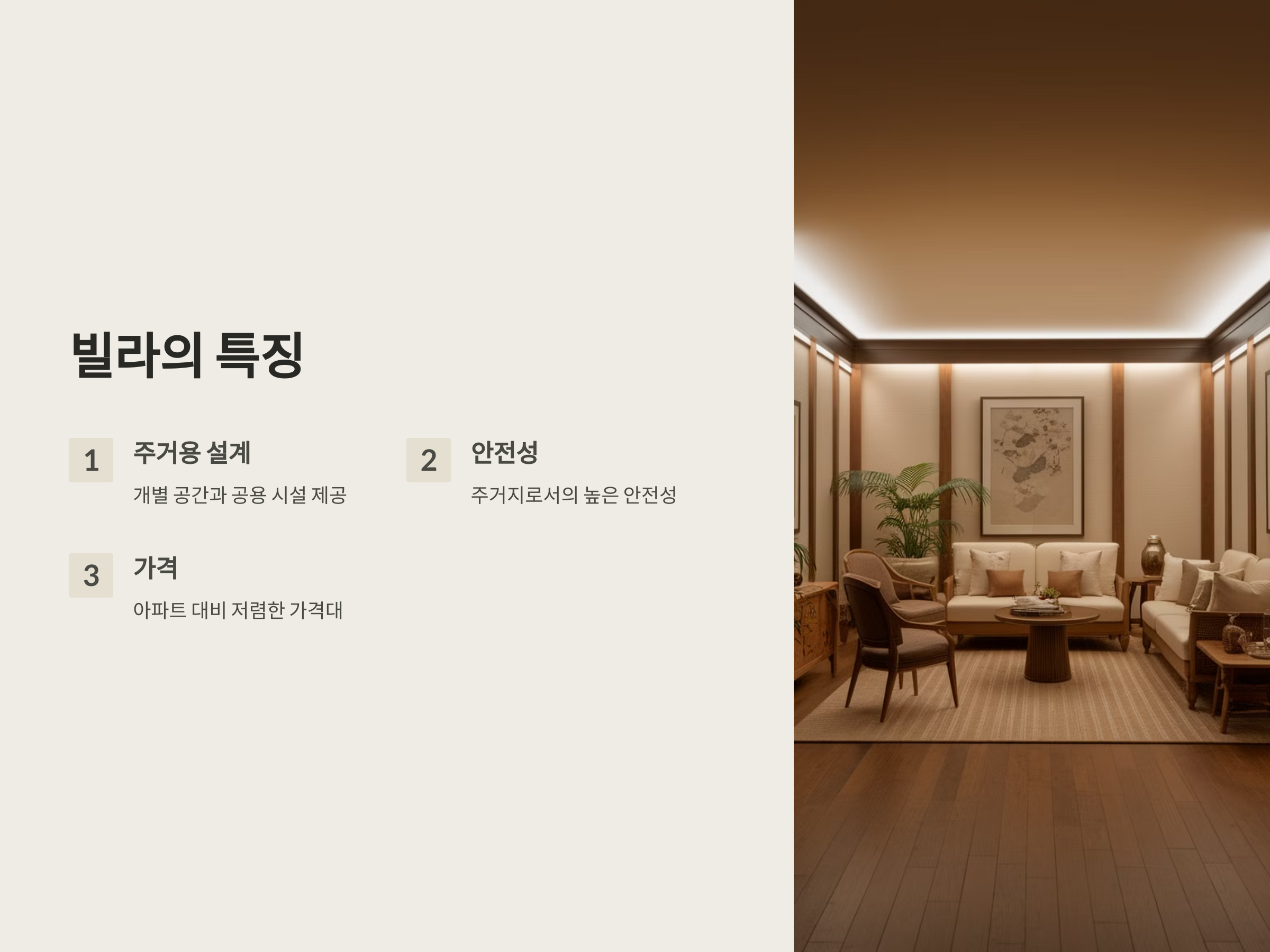 - 조용한 주거지를 원한다면 빌라가 더 적합합니다. 상대적으로 저렴한 가격에 주거지로서 안정적이고, 집단 생활에 불편함이 적습니다.