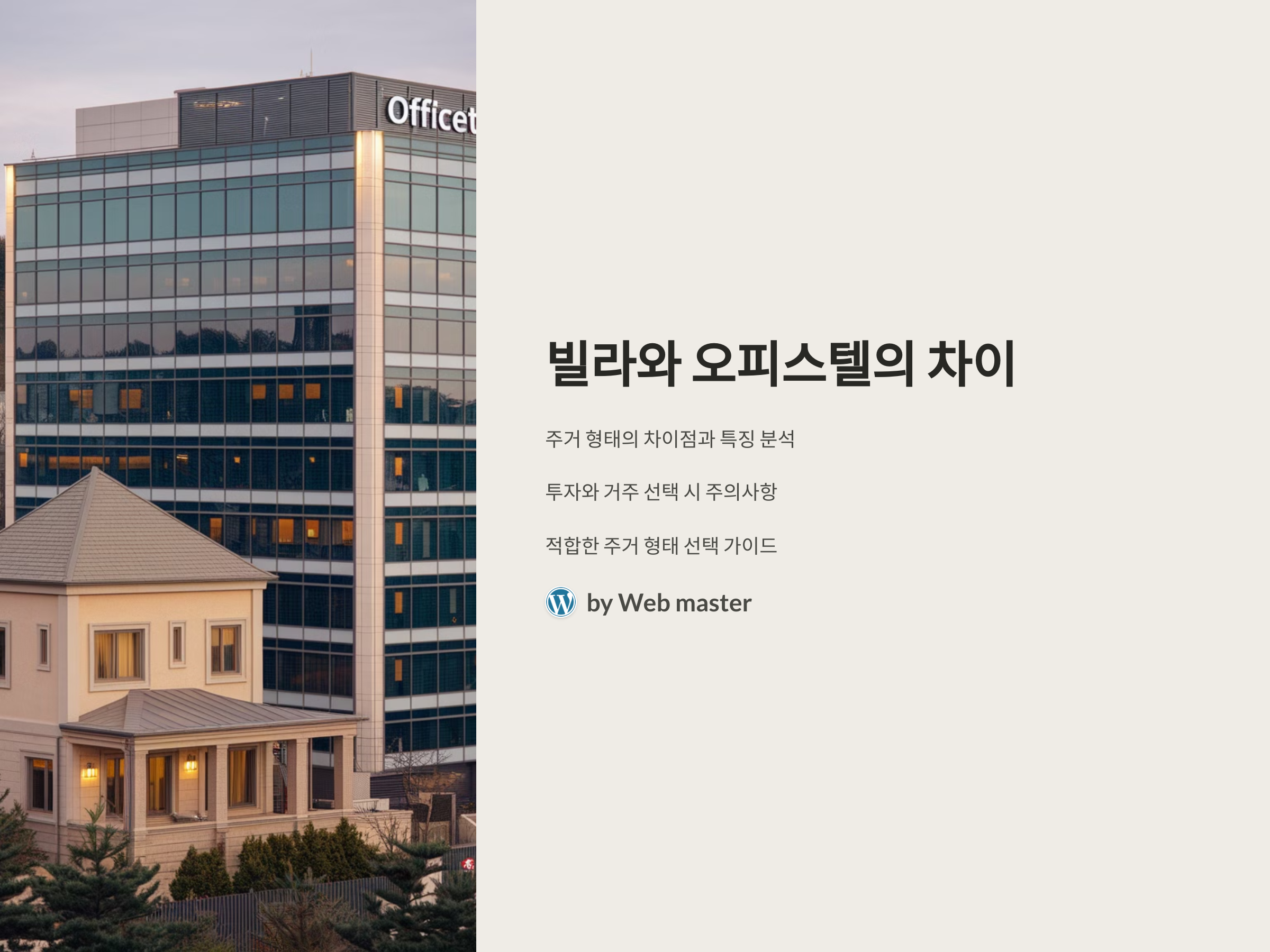 빌라와 오피스텔, 흔히 우리가 일상에서 자주 접하는 주거 형태들입니다. 하지만 이 두 개의 차이를 제대로 알고 있지 않다면, 향후 투자나 거주 선택에 큰 문제가 될 수 있습니다. 특히, 부동산 시장에서 둘의 차이를 구별할 수 없으면 돈을 낭비할 위험이 있습니다. 그래서 오늘은 이 두 주거 형태의 차이점과 각각의 특징을 살펴보고, 선택할 때의 장단점을 분석해보겠습니다. 이 글을 읽고 나면 어떤 주거 형태가 더 나에게 적합한지 확실히 알게 될 거예요.